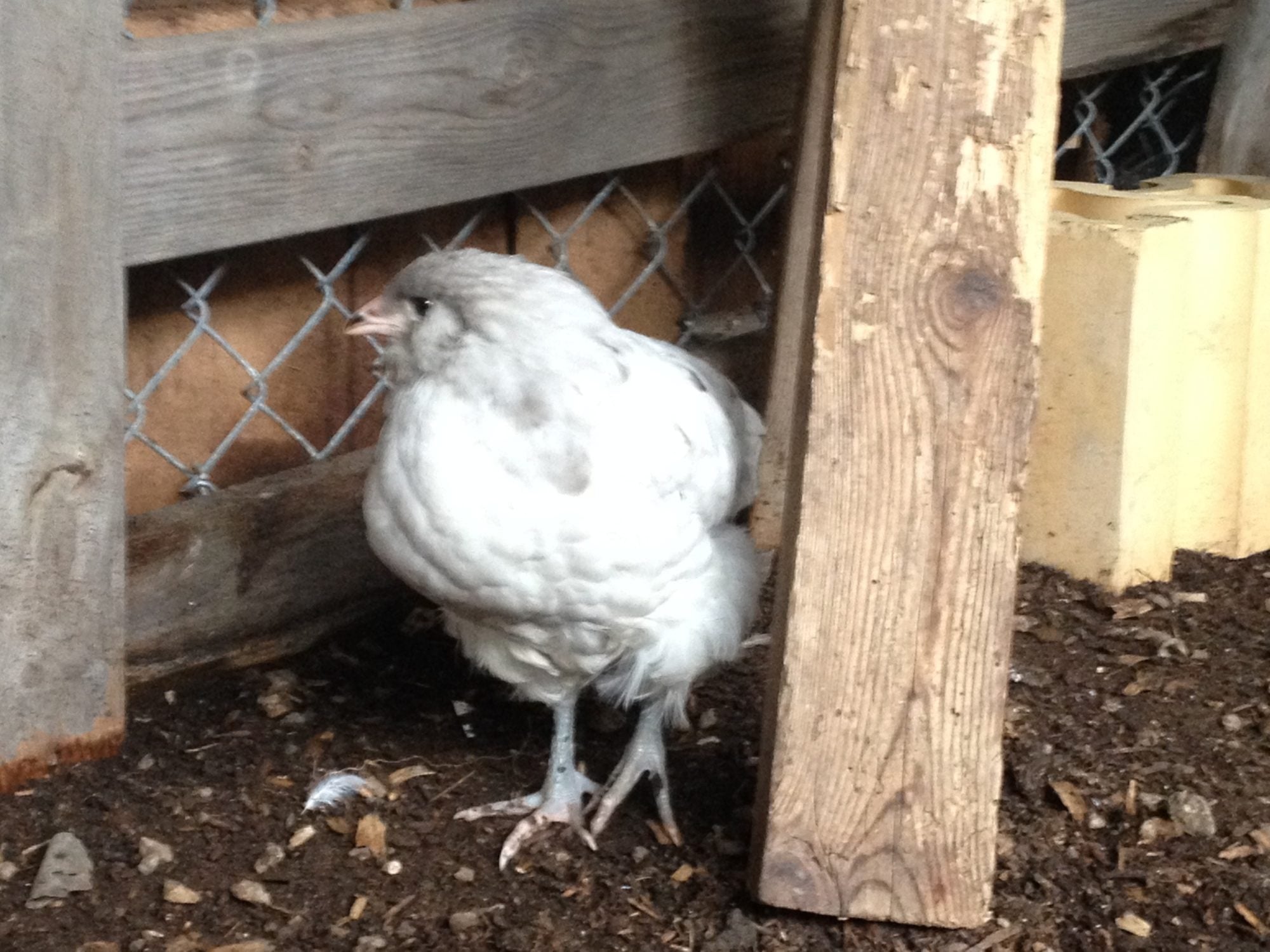 In a small coop a few feet away, Bonbon stays with her four 2.5 week old bantam chicks.