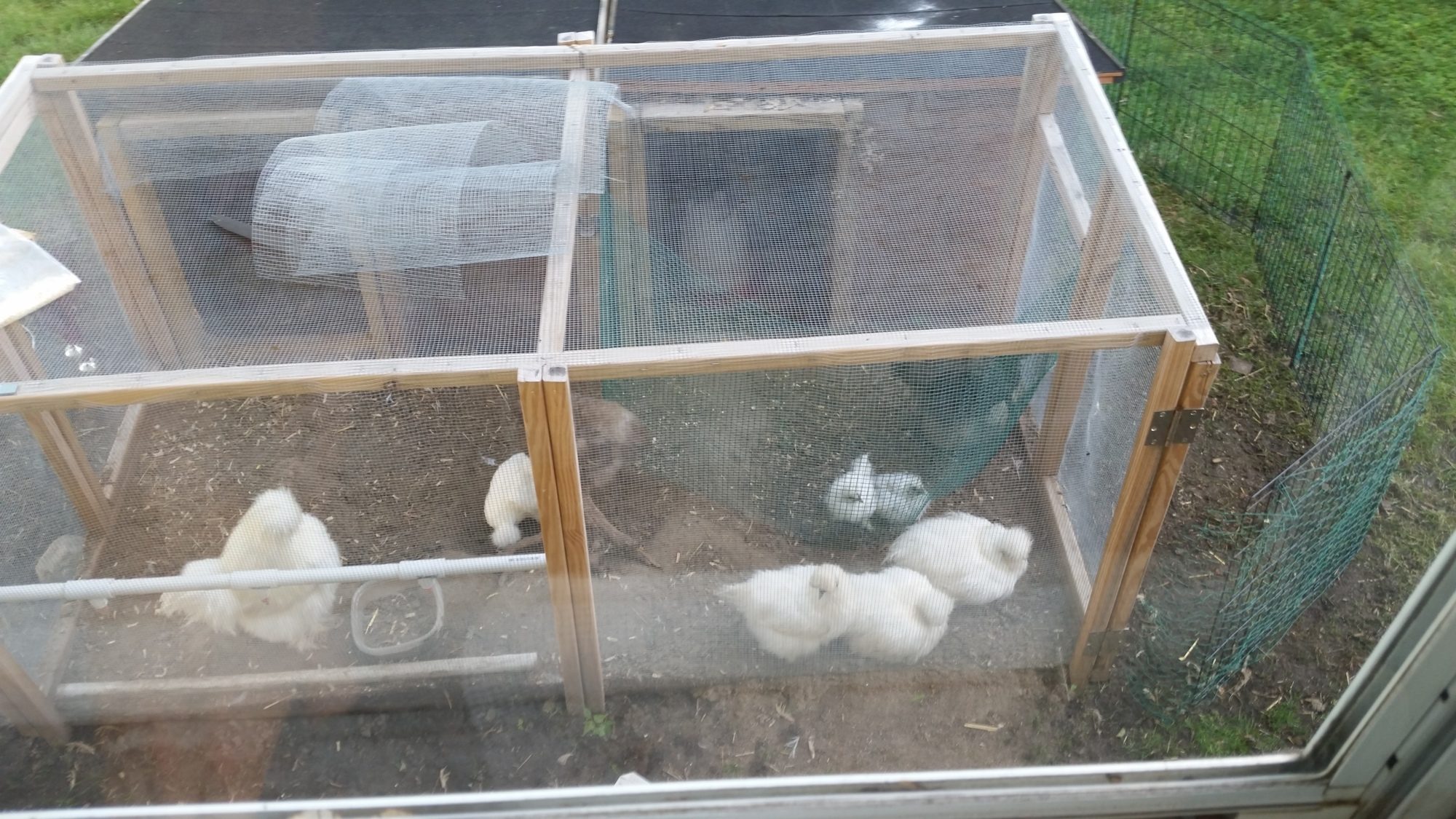 This morning when I got up, DH ran into the bedroom saying, "look outside at the silkies!" The silkies were lined up by the door waiting to be let out onto the patio area. (the gate was pulled in closer last night so I could move some chairs around and is much larger when in use) Guess they really like it out there!![]()