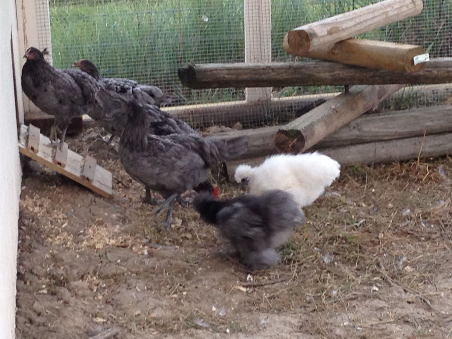 Two silkies (bottom) out with Isbars (15 weeks old, they are a smaller breed when full grown and should max out at 5 or 6 lbs, they are also super docile so are getting along really well with the silkies (go green eggs!!! T minus 6 weeks or so!!!)