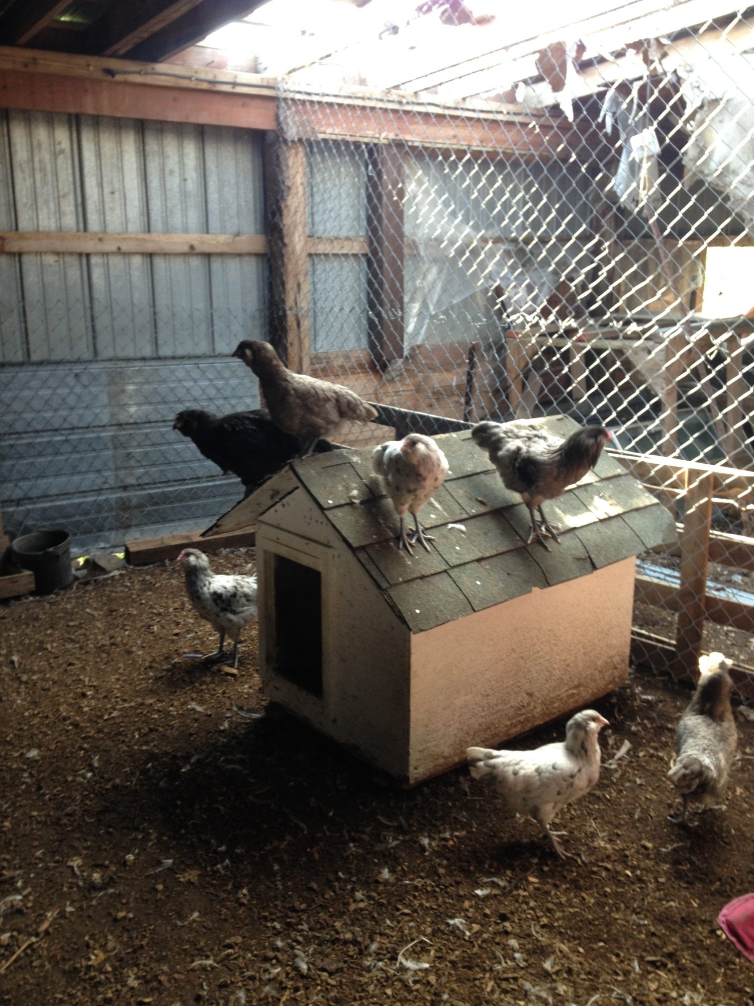 The Ameraucanas are getting big. I don't know if they were practicing flood warning or what, but I caught 4 of them on top of the dog house they refuse to use.