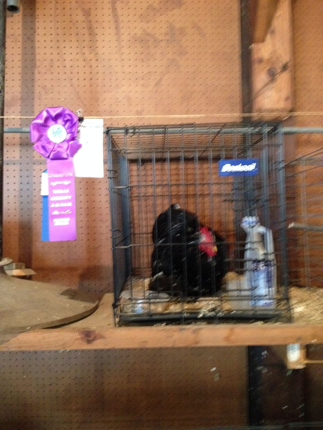 Mottled Cochin Bantam (he was originally in one of the bantam cages, which I could barely fit in them. And then thought I would be able to get him out. Anyways I got him out and after the show I put him back on the shelf with the bantams in one of my cages.)