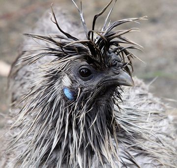 The longer you have chickens, the more used to unusual breeds you'll become. I originally liked barnyard types that looked like chickens are supposed to look. Then, I became more intrigued, and I love my overly fluffy imported English orpingtons and my funny, fuzzy silkies. My OEGB Wheaton roo and my Belgian Mille Fleur roo are both smaller than my silkies. Miniature roosters are very interesting-- so tiny, but they have occasional intense battles. By intense, I mean that they get so close and stare in each other's eyes fiercely like some kind of martial arts exhibition.