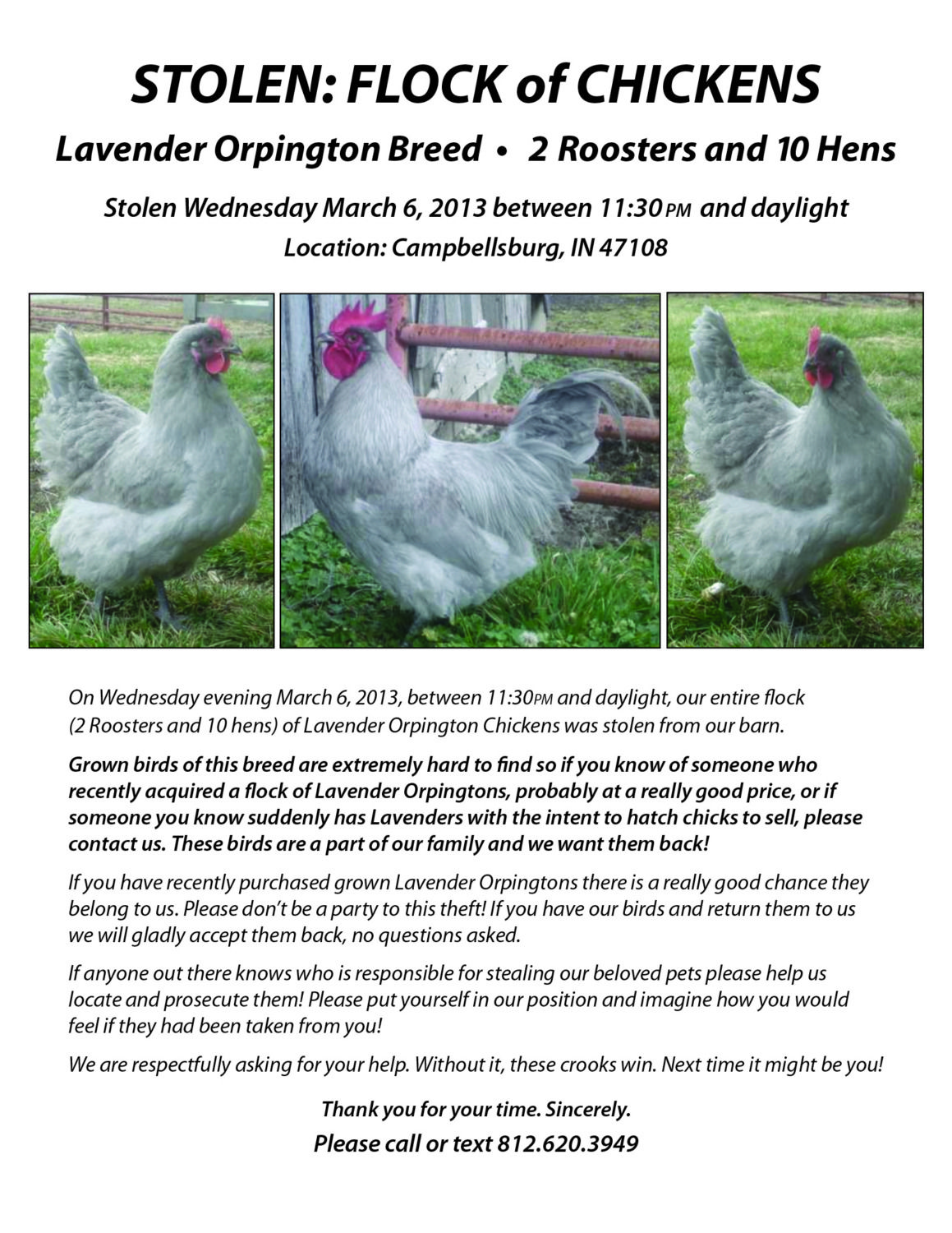 I just took a screen shot of your message and emailed it to the people so they could check it out. Thanks for the info!! Everyone-- don't forget to keep your eyes and ears open when you look on your area's craigslist and if you go to shows or auctions, etc. Thanks!Does anyone know who lost the lav orp in Campvilesville, In? I found a post for some in Ky on craigslist. I don't know if these are theirs but I thought I would post it and they might know. [email protected] This is the reply address for them. Check it out for louisville craigslist.