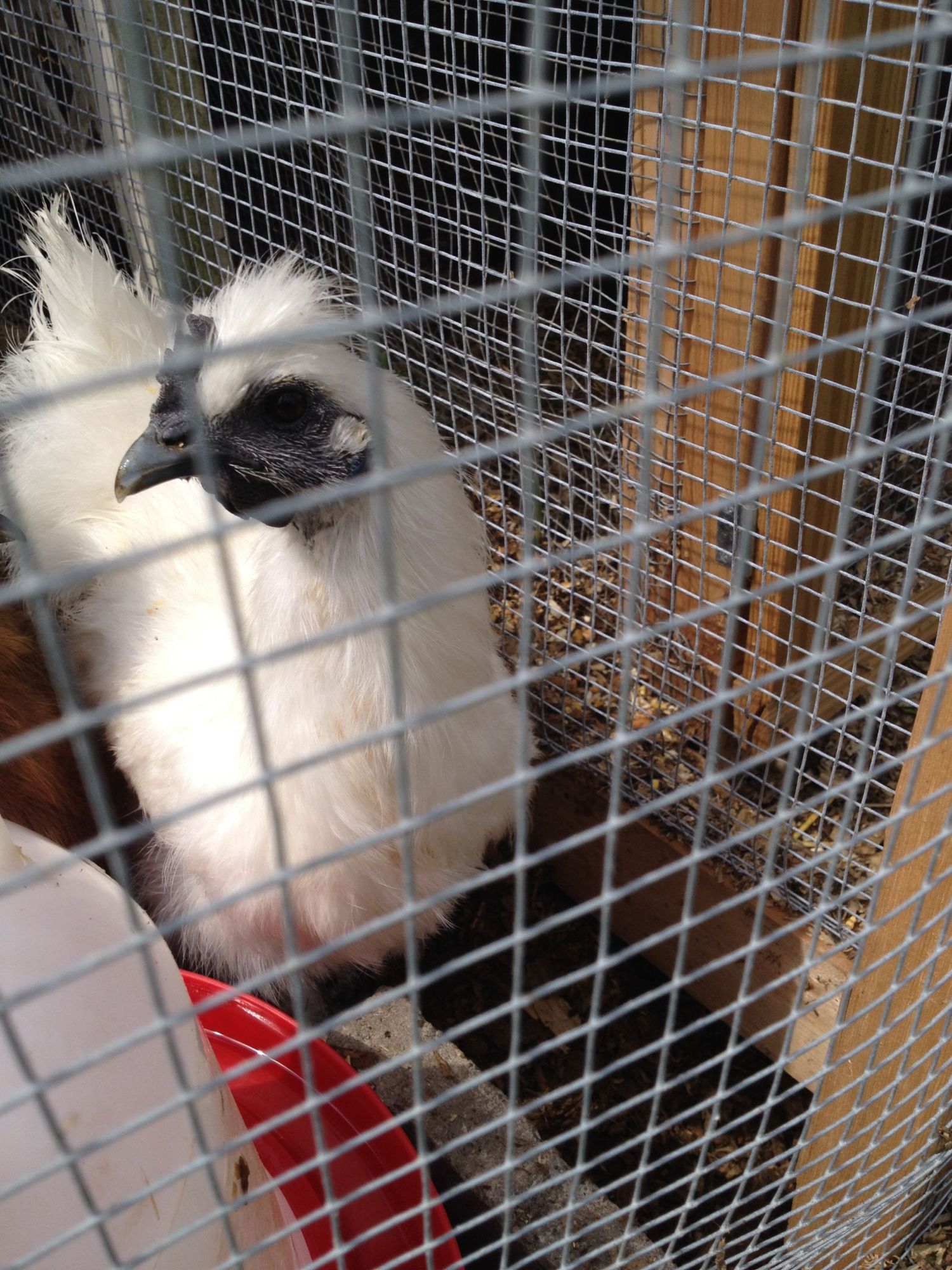 We’ve been having horribly hot and humid temps here, so I’ve had six outdoor fans going for the chickens, plus plenty of cool water, watermelon, etc. Because of the heat advisories, this is what my DH did to Bonbon’s broody coop while I was gone last week.