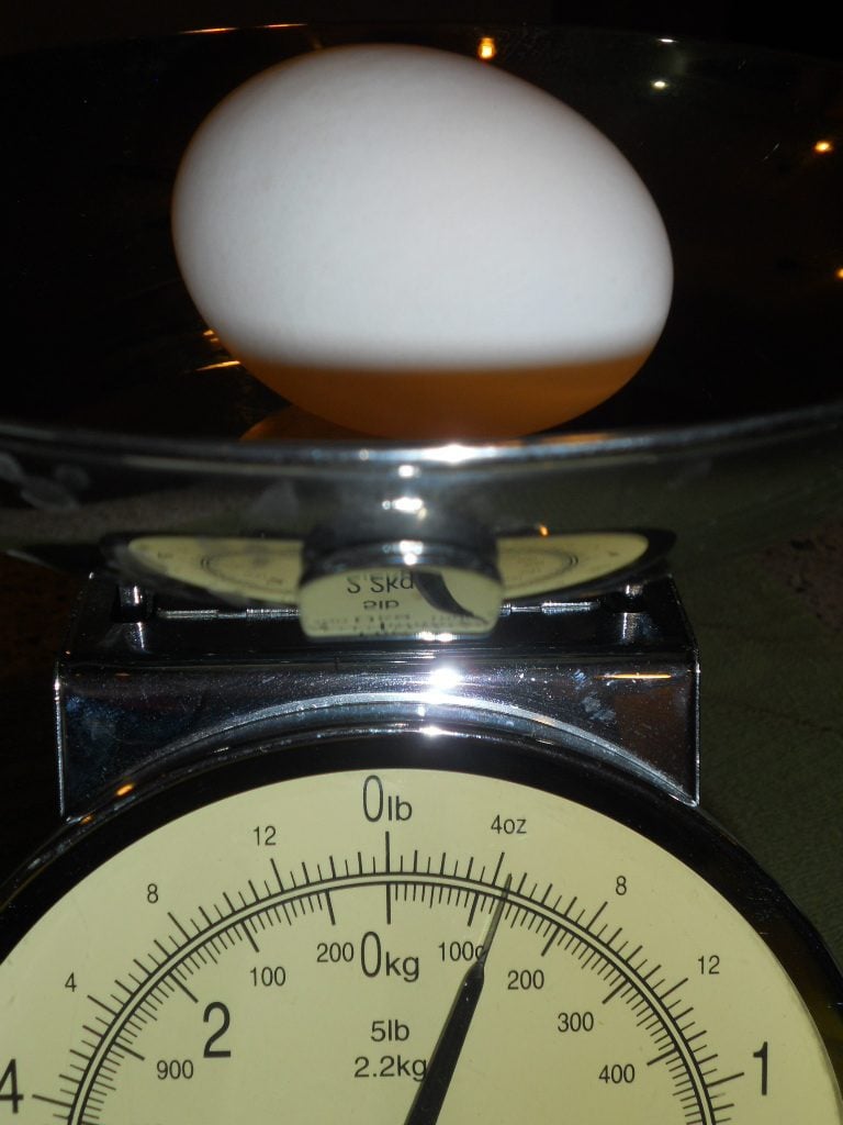 My egg scale says XL eggs are between 2 1/4 & 2 1/2 oz. My duck eggs are average 3 oz. This is 4 1/2 oz.!!