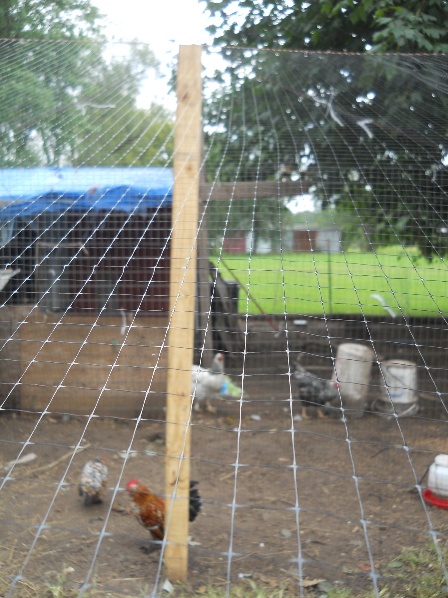 We use 4x4's 8 footers and we put 2' in the ground, and attach to the tree, it looks like a tepee in the 4' fenced pens, my lg run has 7' fence all the way around and so it is easier to hold up the netting. The run we are working on is big enough that we cant buy everything at once so we get a ok of netting and 2 4x4's a week, we need 2 more 4x4's and 3 more pks of netting and will be done, I think we will be done before the cold hits....