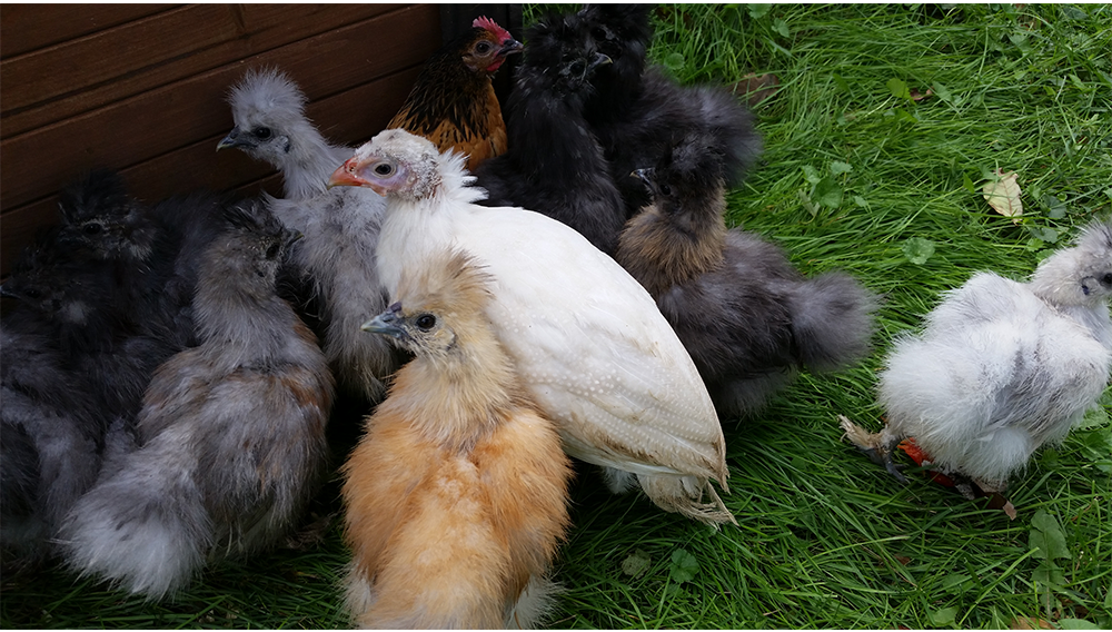 Group photo of the silkie pullets and cockerels at 8 weeks. Loving all the patterns in their feathers.