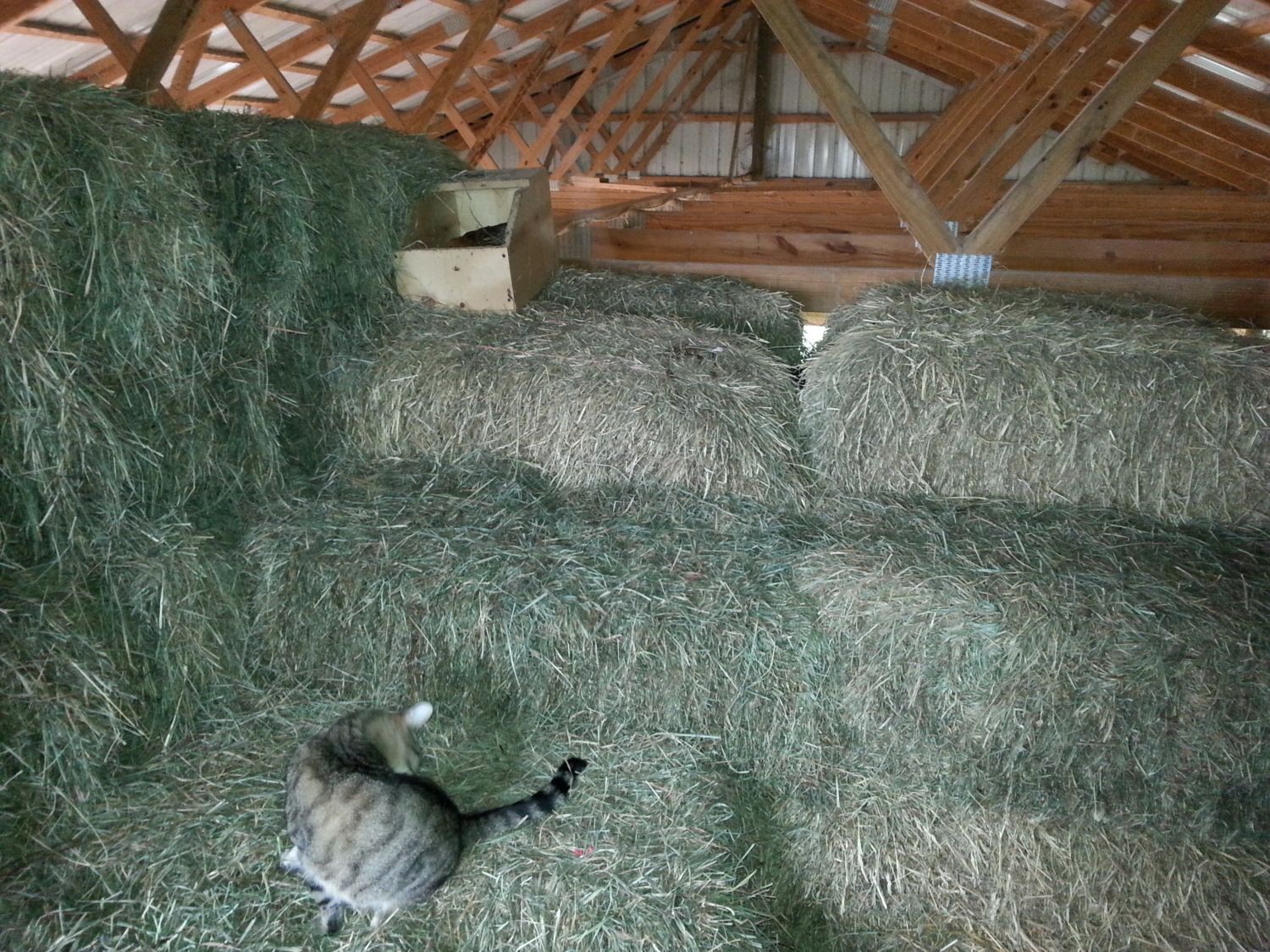 Even though we tried a number of times to relocate her to a nest box or some other space she insisted on returning here, so here she sits. Her little hay nest doesn't look bad until you realize that it is located in the middle of the top 4 bales of this hay stack up in the loft of our barn! I hope they all hatch at the same time because I really don't want baby ducklings up in the hay loft for a couple of days!