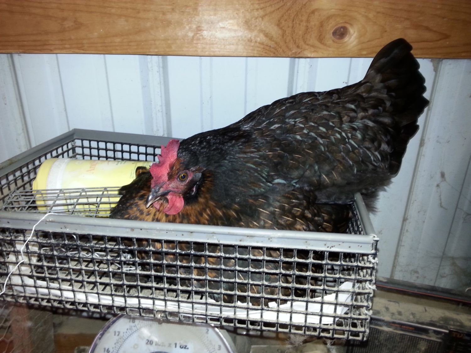 Another one of our girls decided to go broody, too. This is one of the chicks from February that Maggie hatched. She's one of the prettiest girls! Of course she picked a lovely spot to go broody in as well -- the basket of our rabbit scale! I've taken her off a number of times, but it hasn't done any good. She's been there at least a week now...