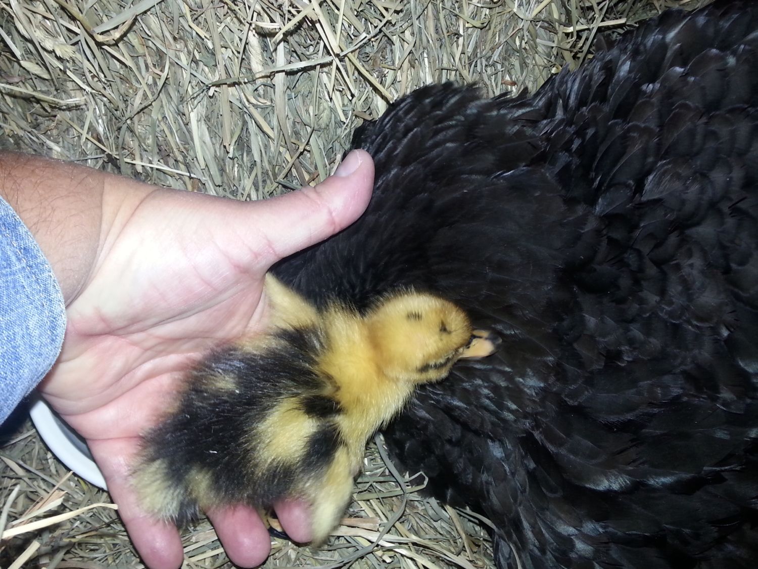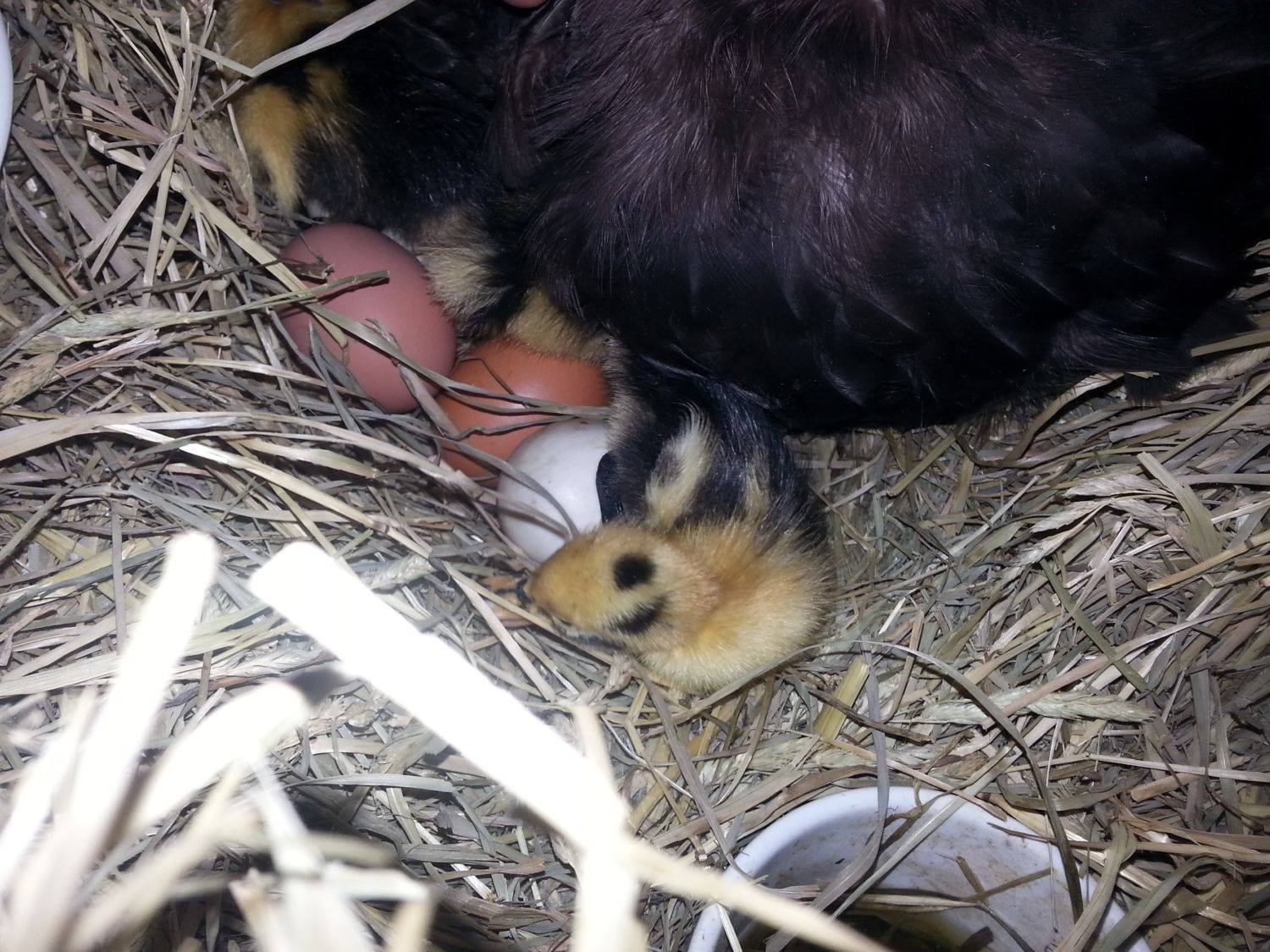 At least 3 have hatched so far! I didn't lift Maggie up all the way to check under her. She's such a good momma! They are Ancona ducklings. (And yes, some more brown chicken eggs got added to her nest by someone. The other day I took out 4 blue eggs from under her!)