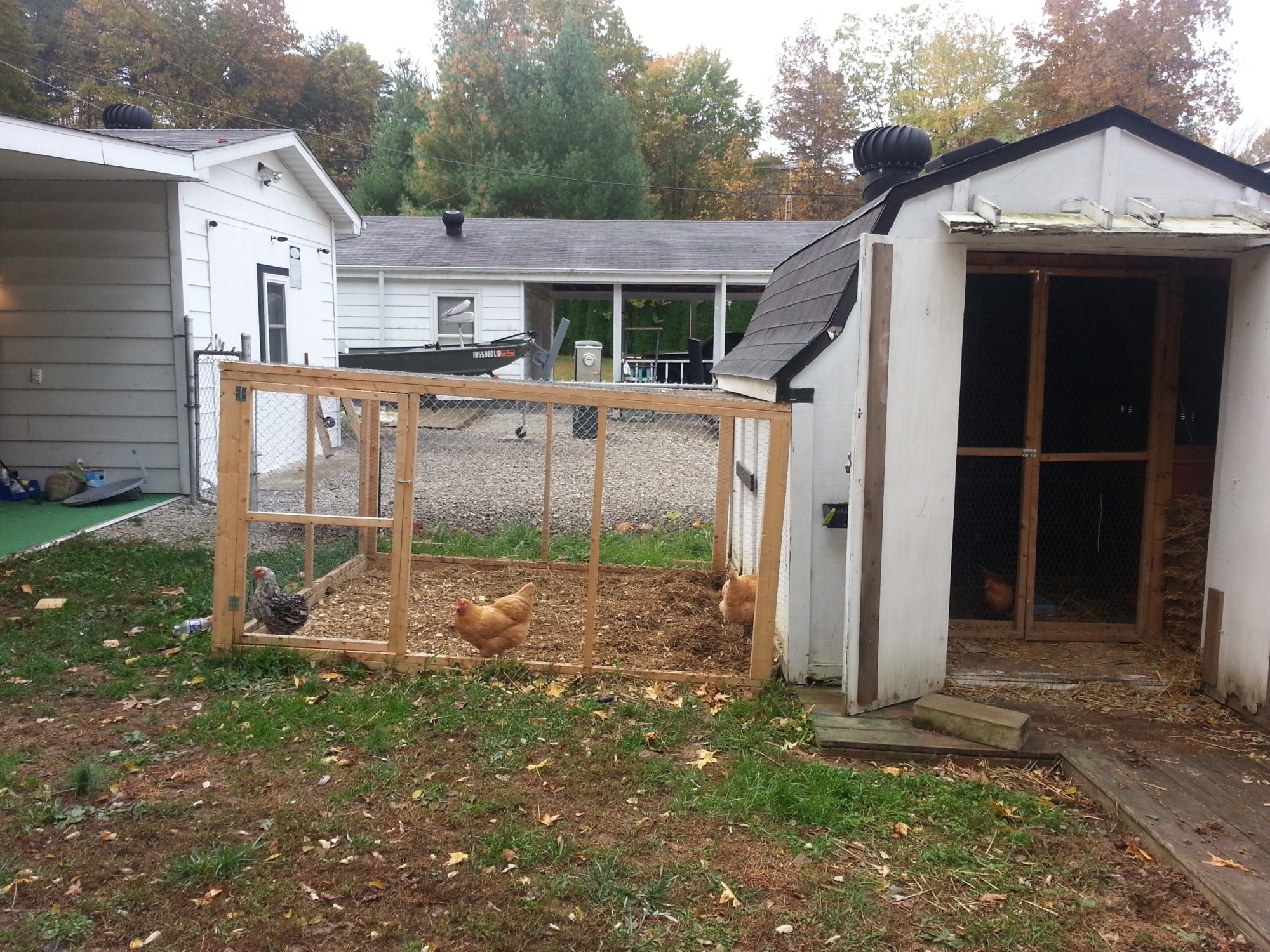 So, this is the coop. Don't mind the mess. The boxer pup is proving to be a hand-ful, tearing through a bale of straw, digging holes and dragging out everything not bolted down. The coop will need to be worked on, but it's doable for the rest of the year. Anyway, as you can tell, the run is pitched toward the coop and a little to the back. Thoughts on how to add a roof to it for winter. The angle of the pitch won't allow for me to build up the end attached to the coop and put on a corrugated plastic roofing type roof.