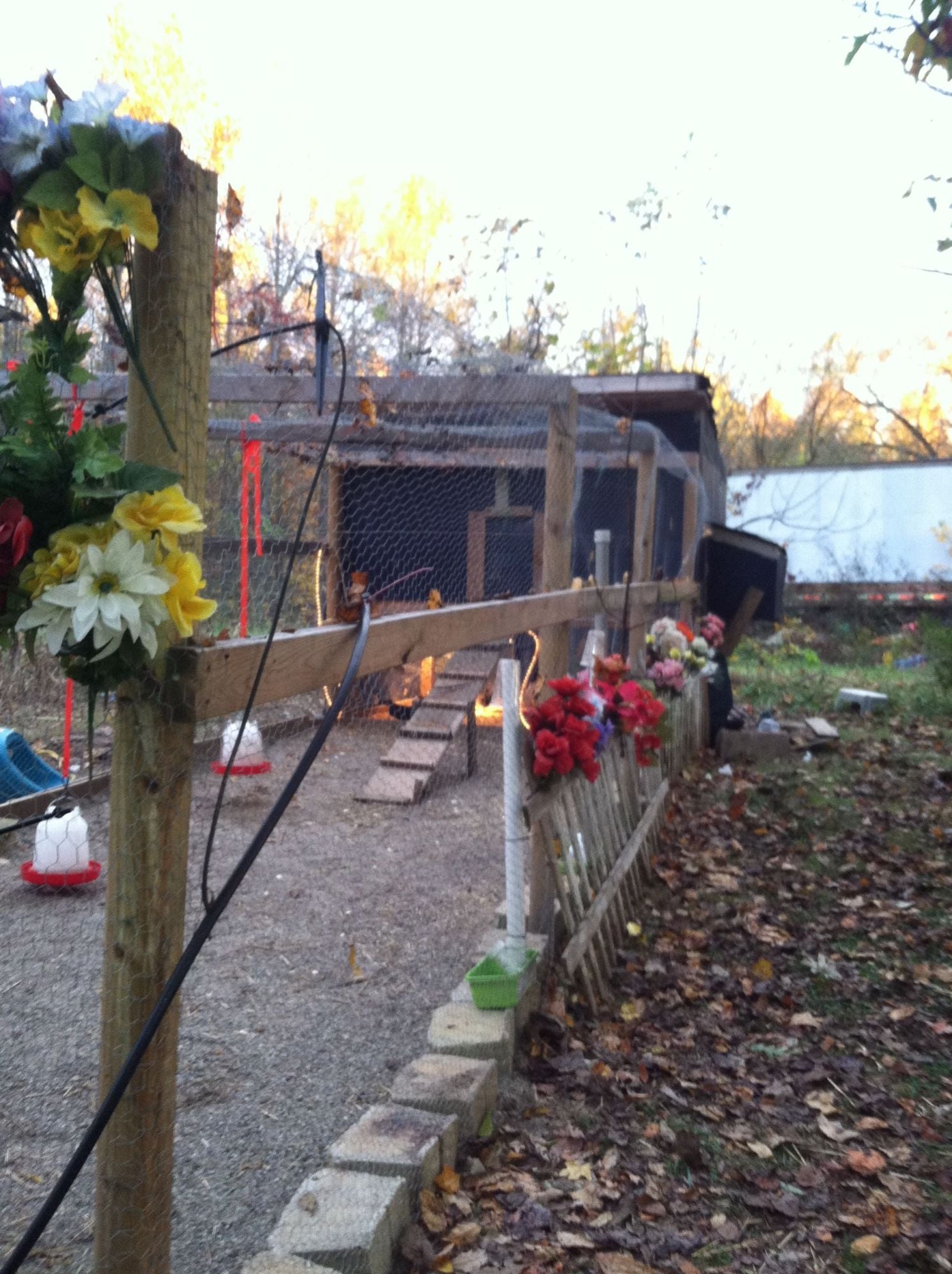 Right now I have plastic cups over the tops of each tube and the food pretty much stays inside the tube and they have to reach in to get it, but sometime today or next week end we are actually going to cover most of the run with a huge tarp, that way it will stay dry and snow free for the most part.