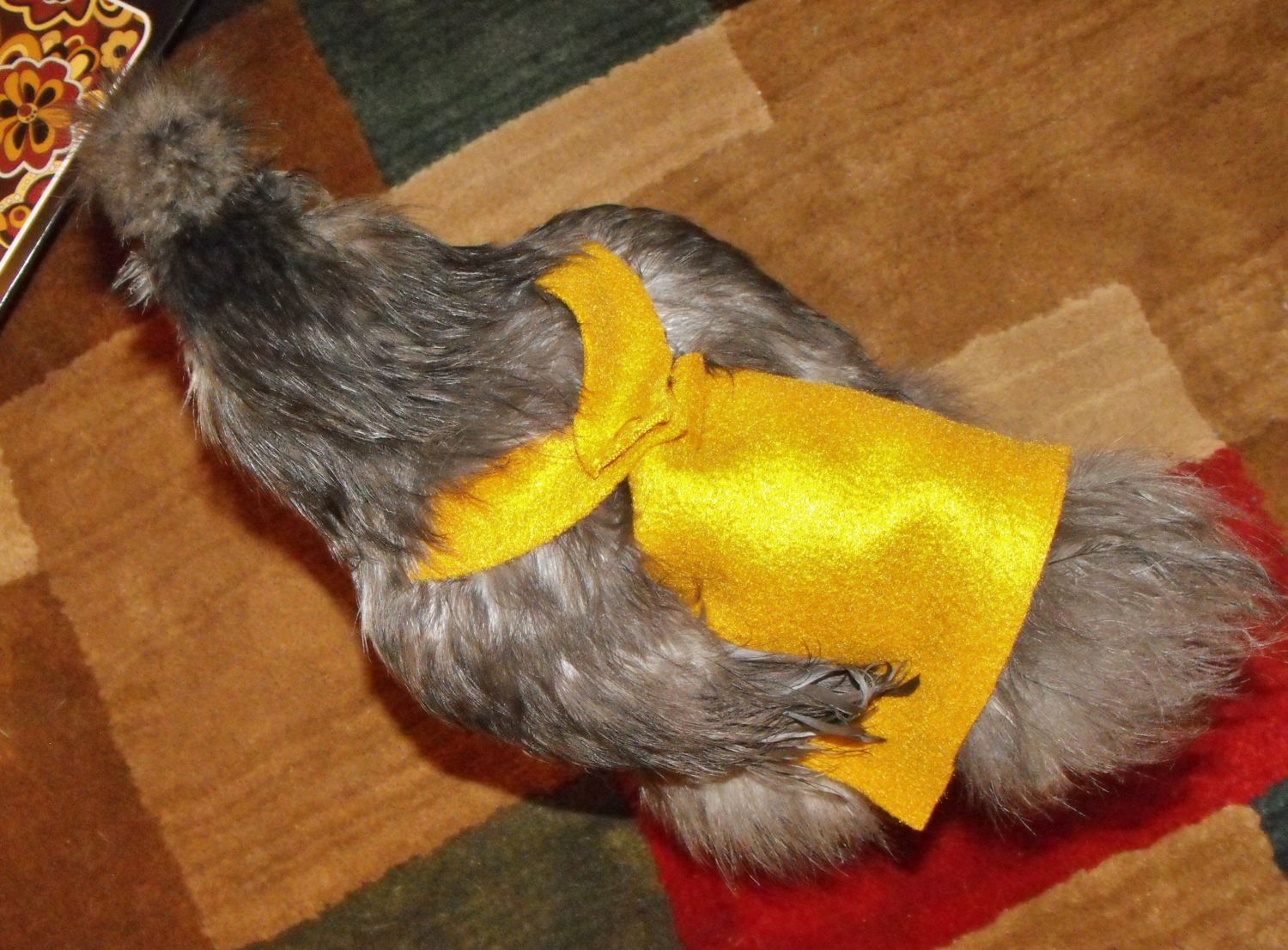 I'm glad none of them have gone to jail lol! My girls are starting to get feathers back, some have molted, some need to!Gus and family are doing great. I got Jules an apron, she is molting, and looks cold. Cricket JR is non aggressive, is pretty good with his little group of hens already, he has around 7 EEs. Gus Jr stays with the BAs a lot, since Bruce is in jail 90% of the time. If I keep my hens, he gets all of them! He is a very nice roo, and doesn't have as big of comb, thanks to Jules. The lil black cochin mix roo is finally growing, has a wyandotte comb, and feathered legs. He acts more wyandotte, and is a bit timid.