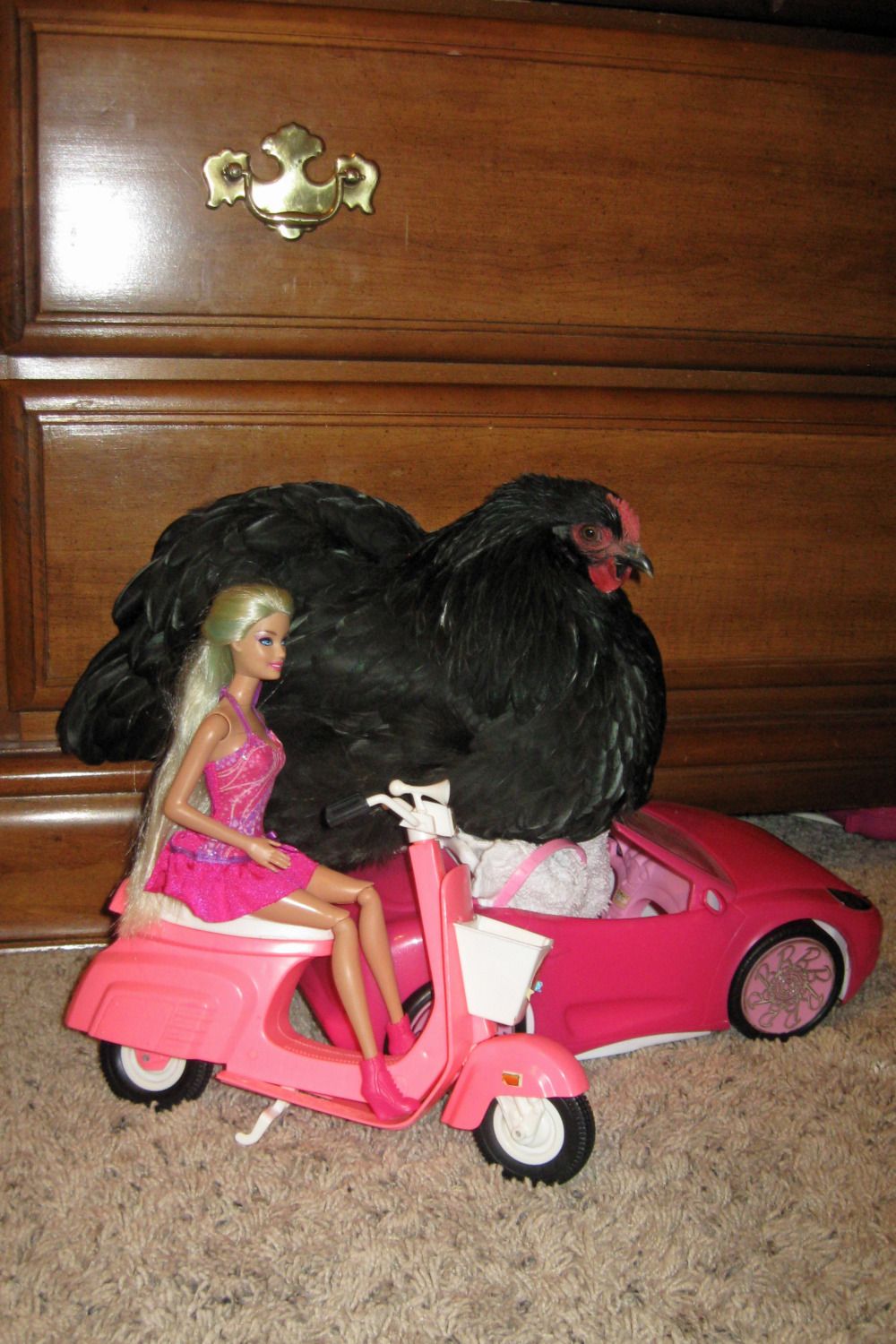 I caught my daughter playing Barbies with our little Bantam Orp today. This is our Bantam Menace: Cookie. Again, I'm not sure why a chicken was needed to play Barbies, but I grabbed my camera. Just too funny. My daughter & her friends are always using the big fluffy, full sized orps as babies when they play house outside. The bigger ones are my favs b/c they just want to be with us at all times. They like to be lap chickens. Our bantam has more energy & prefers to fly up to a shoulder instead.