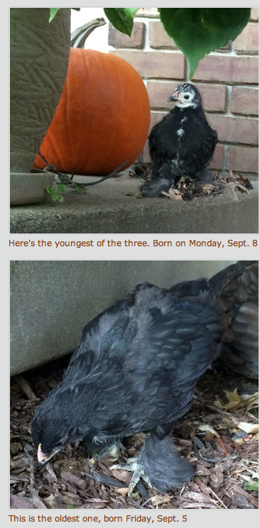 [COLOR=8B4513]The color is correct, and yes, they are all different sizes because they hatched on different days.[/COLOR] [COLOR=333333][COLOR=8B4513]Chicks hatched on:[/COLOR][/COLOR] [COLOR=333333][COLOR=8B4513]#1 Friday, Sept. 5[/COLOR][/COLOR] [COLOR=333333][COLOR=8B4513]#2 Sunday, Sept. 7[/COLOR][/COLOR] [COLOR=333333][COLOR=8B4513]#3 Monday, Sept. 8[/COLOR][/COLOR] [COLOR=333333][COLOR=8B4513]#4 Tuesday, Sept. 9 (went missing last week)[/COLOR][/COLOR] [COLOR=333333][COLOR=8B4513]#5 Wednesday, Sept. 10 (went missing last week)[/COLOR][/COLOR] [COLOR=333333][COLOR=8B4513]Here's the last pictures/captions. Are you thinking that you might see a boy? None have combs like your Poe had. [/COLOR][/COLOR] [COLOR=333333] [/COLOR] [COLOR=8B4513]Btw, your little duckies are adorable! You got some over the summer, too, didn't you? I assume you'll integrate them into your new Duck Villa?[/COLOR]