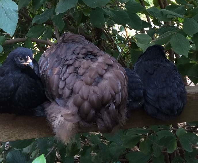 Bantam Chocolate Orp Bonbon and her three chicks roosting with my Jubilee Orp, Adeline.