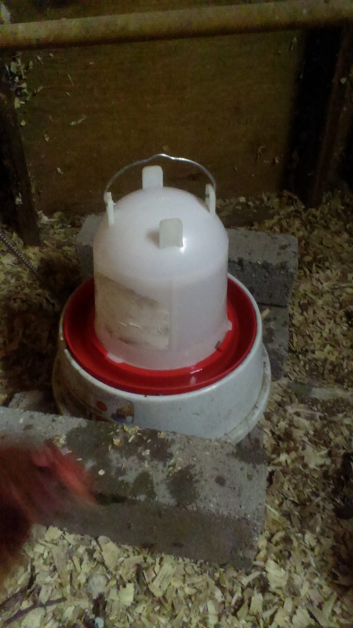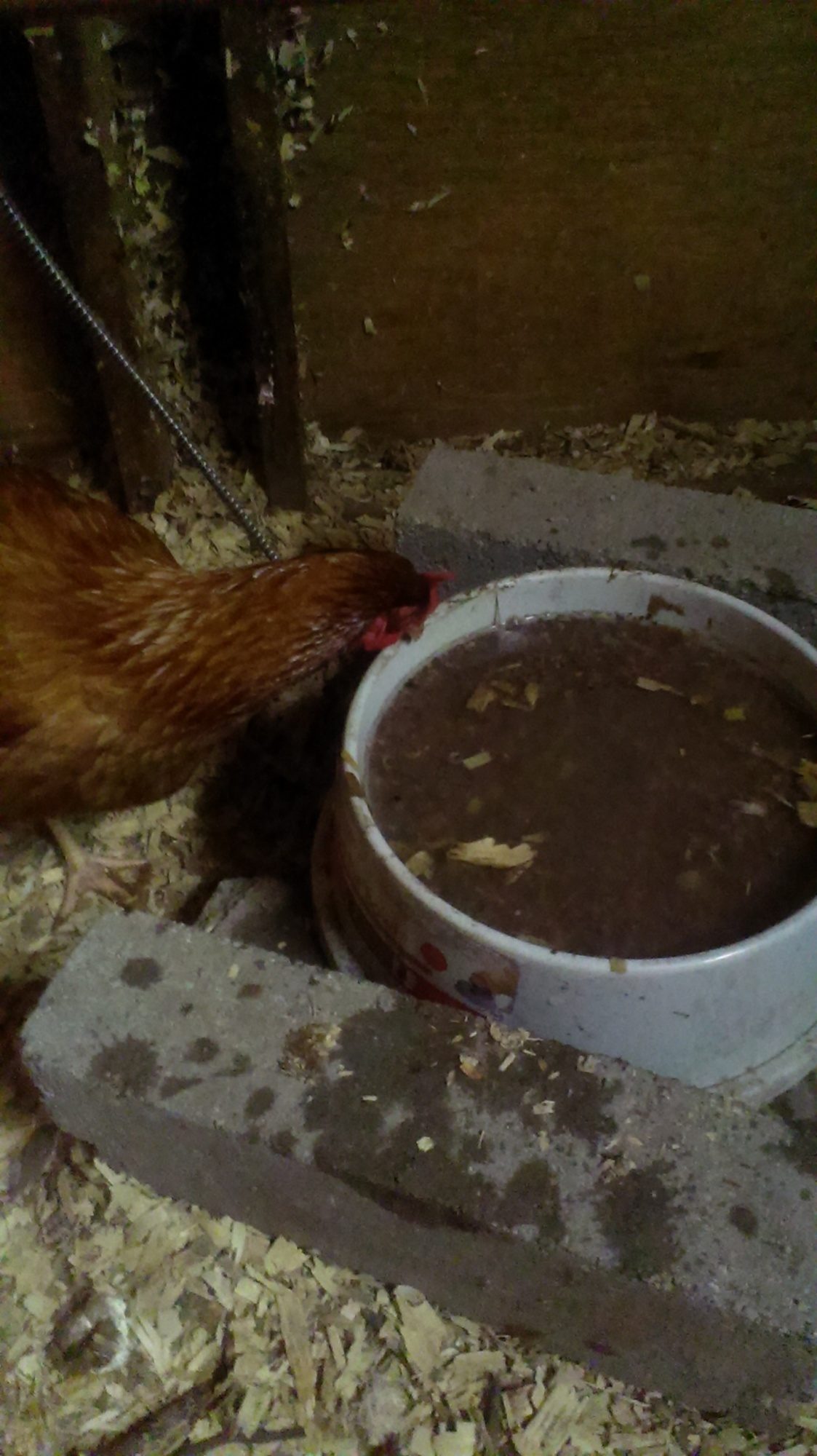 Here's my 1.5 gallon heated water bowl. I got it at Petsmart; they price matched it to the one Rural King sells for 20 bucks. It's mostly full of grit, and topped with water. It's not as dirty as the pic makes it look.