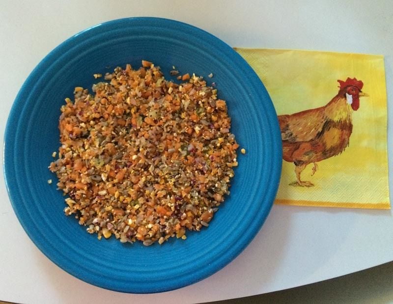 [COLOR=8B4513]Why, Monday does look just like her mother! lol Thanks for sharing. I think that Friday and Sunday look like Cochins, too. And[/COLOR] @jchny2000 [COLOR=8B4513]said (and others have, too) that they're docile. Mine are pretty feisty. They love to run up to the food bowls right in front of the LF hens who are offended. lol They don't seem to care what the big hens think. They love to run up to us. I think part of it is age-- they're like eager puppies. LIttle Monday makes a screeching sound almost like a broody when she isn't happy. My DH says she sound like that screaming goat video that went viral. haha[/COLOR] [rule][COLOR=8B4513]Today's treat. I put salad stuff and kiwi in the chopper-upper gadget and added sunflower kernels. The hens said they would have preferred a warm entree. [/COLOR]:P
