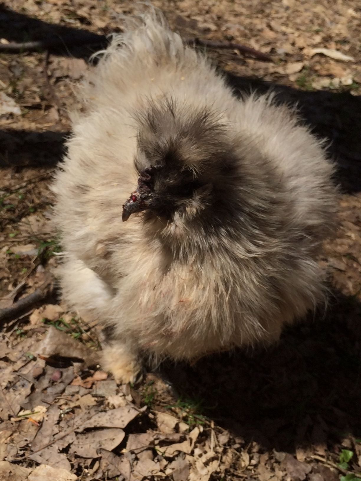 Well, this morning she seems better. I saw her eating (or at least trying to eat--hard to tell how much goes in the mouth, isn't it?). She also pooped, so I know she has been eating. She had something white on her beak, which I think may be the hard boiled egg I left her. It seems to be all gone, so either her or the other birds ate it. All good signs! She still looks pretty rough. Needs a bath.