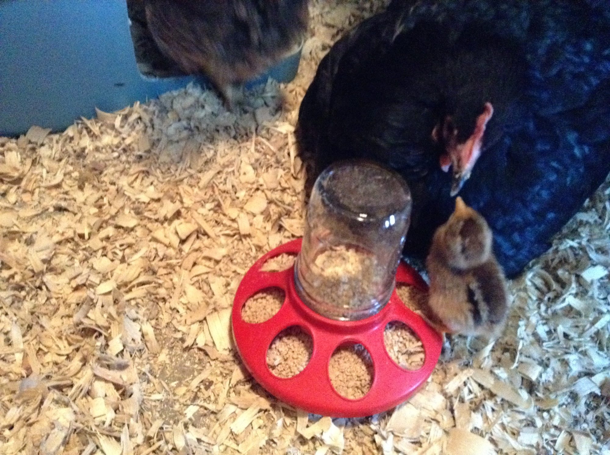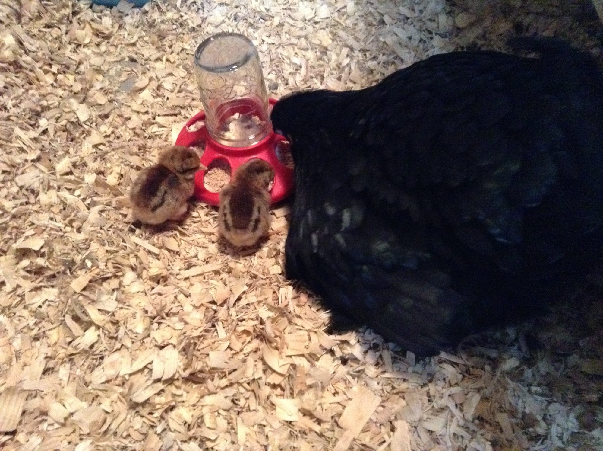 The new mom finally left the nest box with the kids. She's been teaching them how to use water nipples and where the food is. One of my favorite things to watch is mama hen teach the chicks.