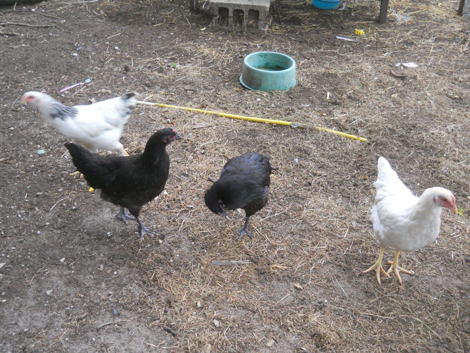 Next to the house, Littles and momma hen with foster chick and on the far end Waddles and Chubs