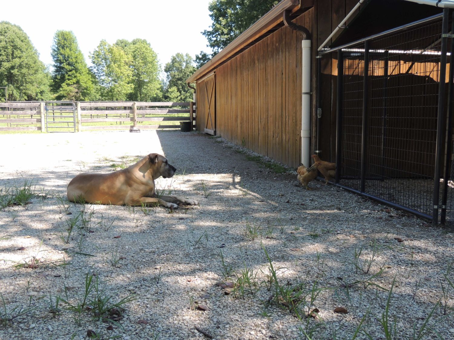 The most annoying things the dogs do: the beagle sticks her nose through the chain link squares to try to eat chicken poop, and the pit-mix puppies sometimes charge the fence to watch the chickens fly all over the place. The chickens are wise to this game and don't respond every time.