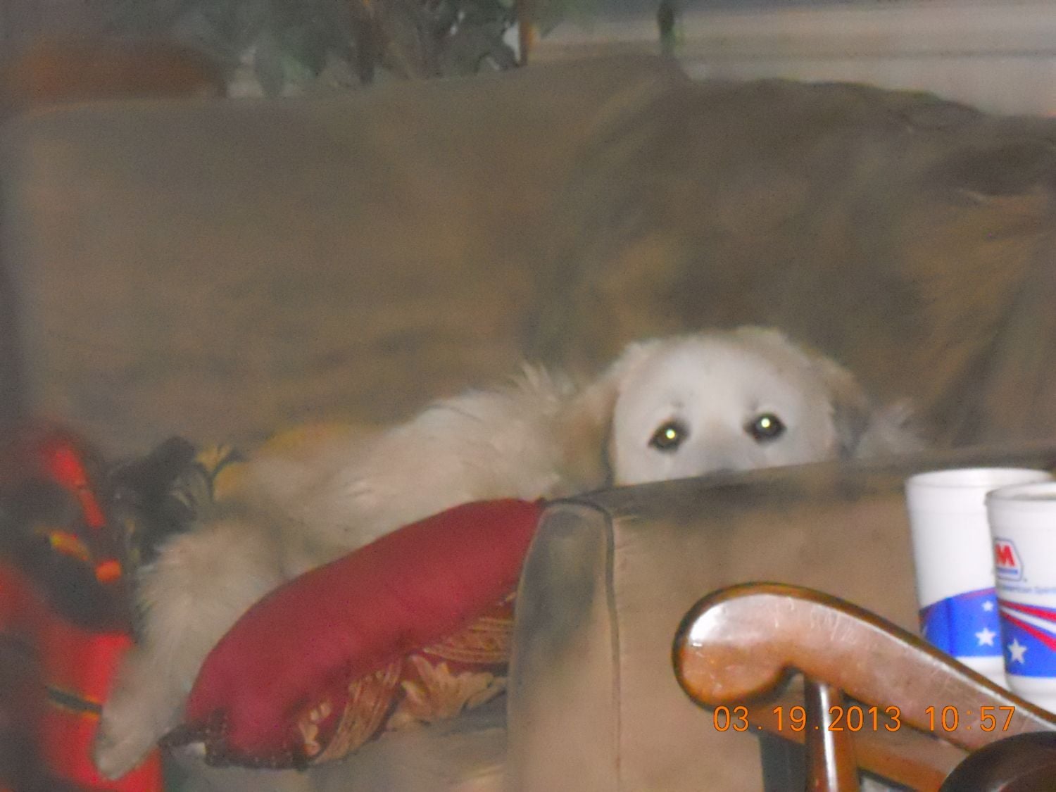 Buddy he is hiding ( he thinks ) cause he has a bone on the couch, he knows better then that. lol