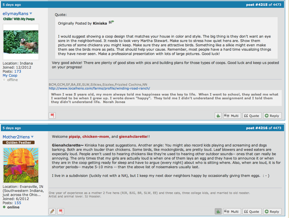 strssedmom!! That is horrible. danand may have been referring to this conversation (below--posts 4215 & 4216) about a new member who has to have her coop approved by a Neighborhood Association. Kiniska had good advice about the coop and I just pointed out some comparisons to other outdoor noise in case the NA brought up noise as an issue.It'd be worth a try!! And I like the share the eggs idea with the neighbor. Someone else on here was going to have the same problem and someone suggested all kinds of info on doing a presentation and offering current info and stuff. Wait for more feed back here!!