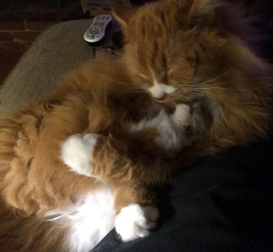 Speaking of Cats ~ I took this out-of-focus pic of my Lionel (the best cat in the world). I love how he uses his two front paws to hold his back foot so he can wash his toes!