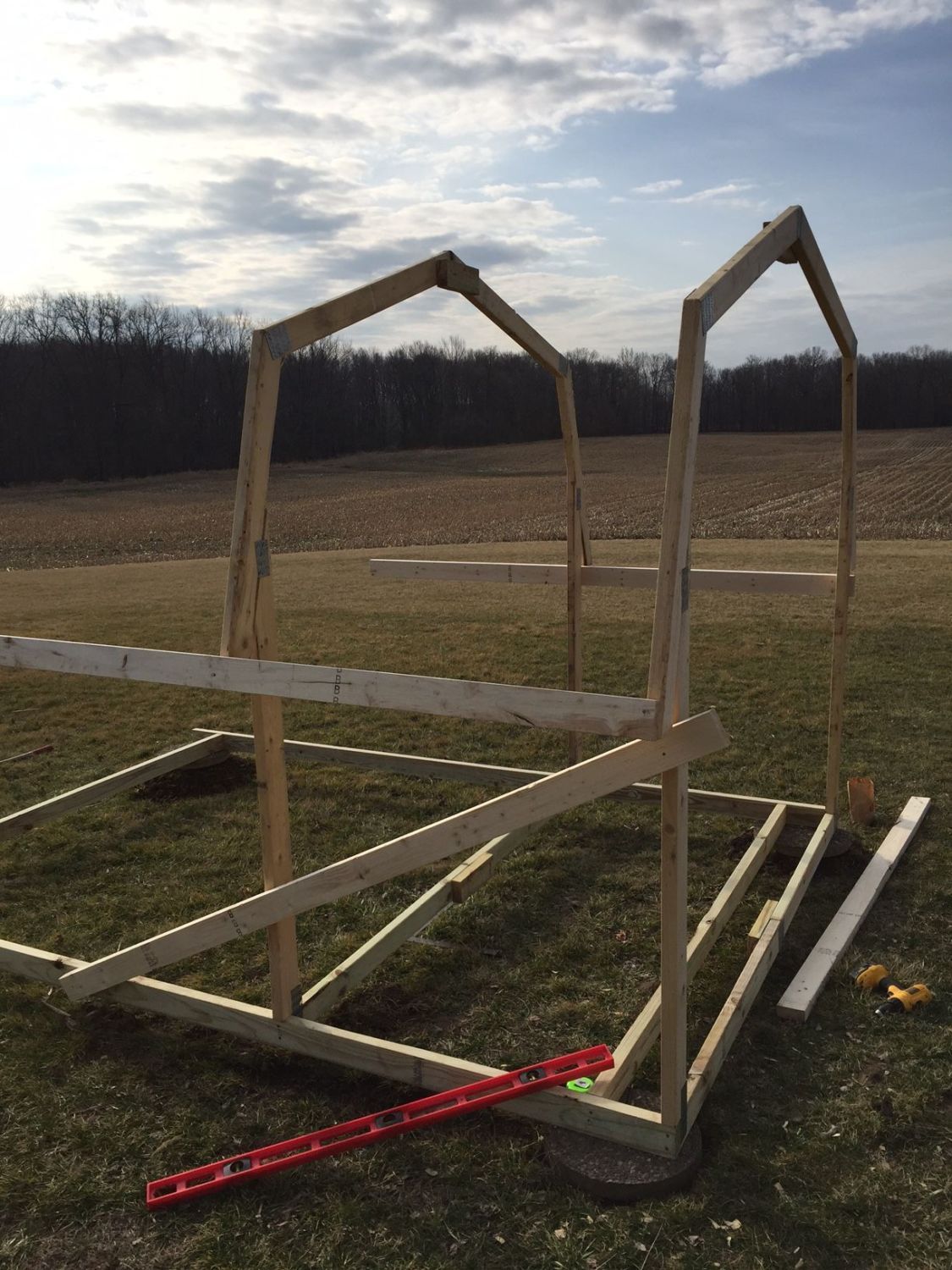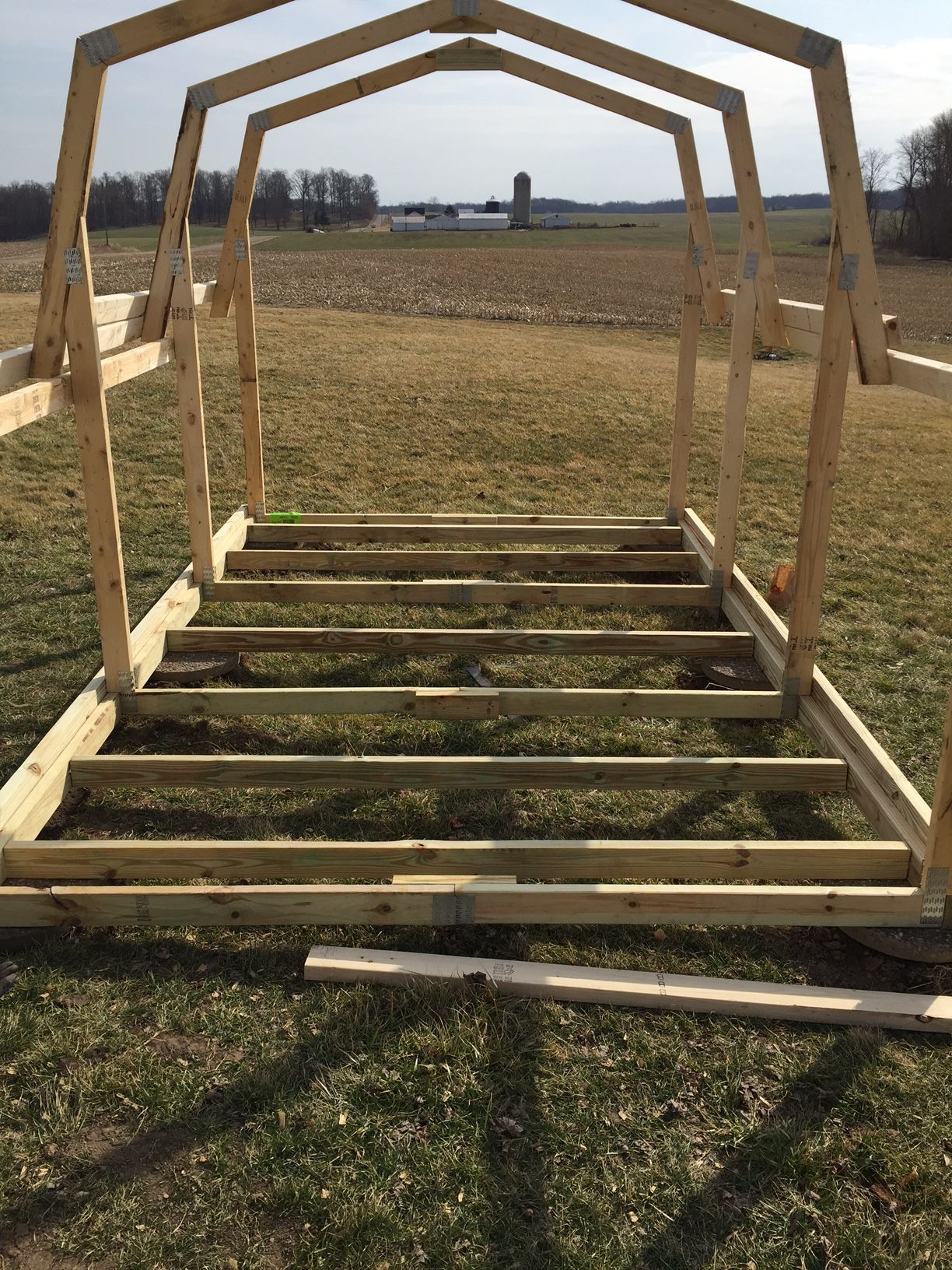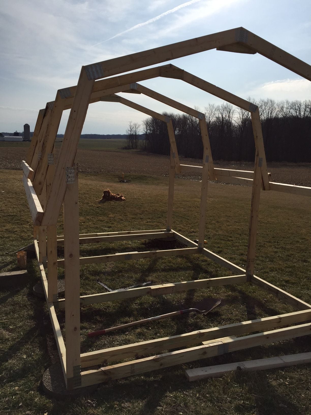 I'm using gambrel roof ez-frames that I got at menards. They suggest using 2' center for sheeting and siding, but i'm wrapping in sheet metal like a pole barn, so i'm using 4' centers and letting the perlins tie it together. Saved a fair bit of money using the frames rather than stick building the entire thing also, and a lot of headache working out the math for the gambrel roof. It will be about 8' high in the center, and i'm still working out exactly what i'm going to do, but I have some vented soffit material that I think I will use at the first roof line break for ventilation there, as well as at the side, and the ridge venting. The wind made getting the frames in place and plumb a chore. The rott puppy was not helpful at all.