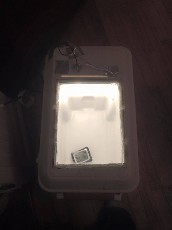 Do you have a fan inside? I just built one and have been using it for a few weeks, about to start work on number 2 this weekend. It took me a few tries to get things right. First attempt my thermostat was too far from the heat and the temp fluctuated too much. Caused some eggs not to hatch and a few to hatch with deformed feet. Moved the thermostat closer to the light and fixed that problem, temp only moves about 1.5 degree now. But then I had to move the fan some too because of hot spots inside. I cut down a electric turner for a Styrofoam incubator to fit my cooler, it only holds 28 eggs now but works well. I have a batch of silkies and bantam polish on day 9 and a few MW turkey eggs I just put in today. I should have number 2 done by next week and that will be my hatcher. I plan to take pictures of the procedure this time.