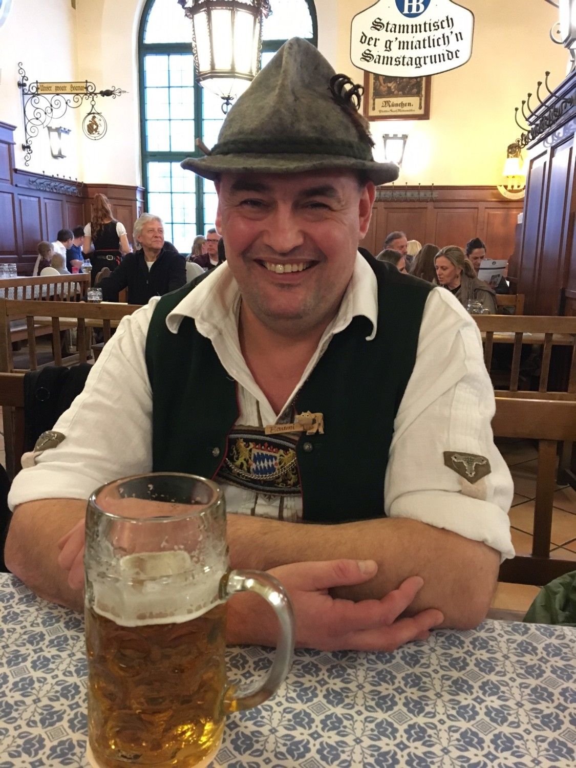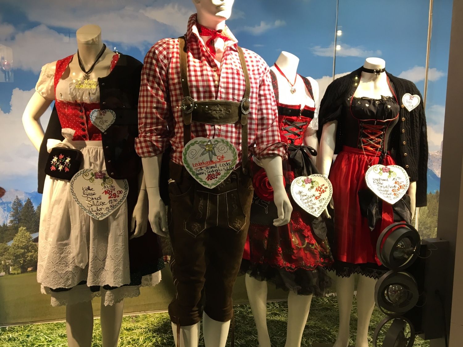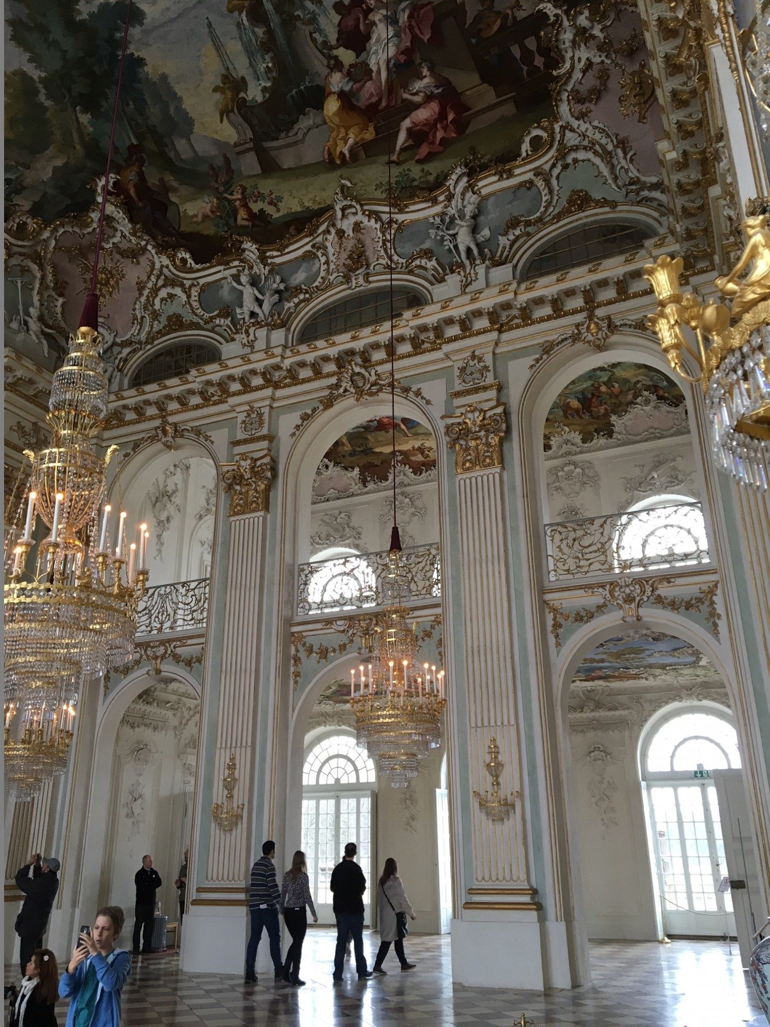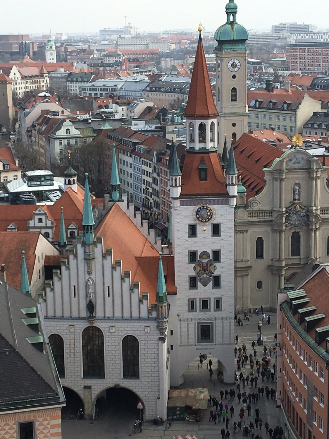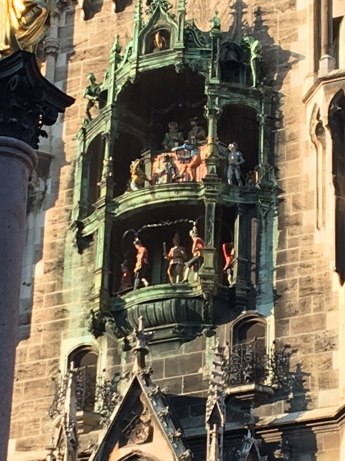 (Glockenspiel, lederhosen, steins, Dachau concentration camp gate, Marienplatz square, German guy in Hofbrauhaus, Raphaels Madonna and child, the Alps, Schloss Nymphenburg Palace)