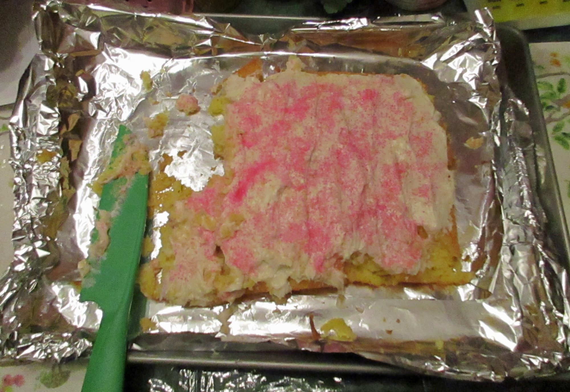 Meanwhile DD baked me a cake. She forgot to spray the pan, so she removed it in clumps & tried filling in the cracks with frosting. Why worry about sticky crumbs in the frosting when one can simply add sprinkles to hide them! Lots & lots of sprinkles! It was a mess & then I had to clean up the kitchen, but it was made with love.