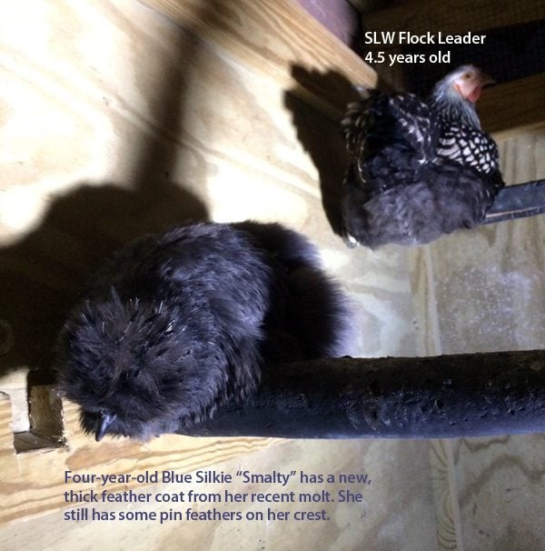 Hi everyone! My chickens have helped me cope with a bad year, and I've especially enjoyed my newest little ones from @ellymayRans — Black Bantam Cochin Frizzle girl, two months old. They're still in quarantine in my basement bathroom although I extended their space so they could look out the sliding glass door to the backyard. Although I had full spectrum lights in the bathroom, I felt bad about them not having a natural light source. The first day I saw my four pullets that I got last summer from @kittydoc looking through the glass at the chicks. When the four saw me, they turned around and ran like they thought they weren't supposed to be looking. Haha They are always well-behaved, and I've still never seen them peck each other. I've kind of wished they could be a separate flock from my three four-year-old hens! The three hens occasionally peck the new ones, but mostly give them the stink-eye. The four pullets are beautiful, sweet, and are excited about everything. They're like, "Oh boy! We get cut-up grapes!" "Oh boy, we get to go on a field trip in the far backyard with Mom!" The three jaded hens are like, "Grapes again?" "Same ol' field trip again! Boring!" At nighttime, after changing positions in the coop several times, the four pullets decided to sleep on the top perch with the flock leader, my SLW Lacey. Lacey gripes about it, but I trained her not to peck at them in my usual way—I look a chicken in the eye and just point my finger at her and say, "No!" Meanwhile, the four pullets haven't started laying—They should be old enough, so I'm guessing because of the season change. My jaded hens haven't laid in at least two months. They went through major molting and then the season changed. It's been a long, dry spell!
