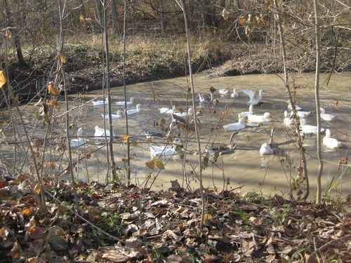 This is such a great photo of your Scovy and Pekin ducks along with your Chinese geese enjoying your pond—looks like a Poultry Pond Party!