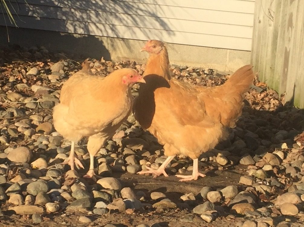 This was "Ginger" and my "ginger" son. Note that this is the orangest RSL I've ever seen, and she's about the same shade of "red" as my very ginger son's hair. In better light, they were almost exactly the same color. Still darker than buff, but quite orange. I think you have BOs. I've had a few hatchery quality BOs that looked like them. Check their earlobes, but if they're red, you've got BOs. Their tails are buff, which is a dead winger for buff unicolor (almost always BO, but could be another buff unicolor like minorcas)