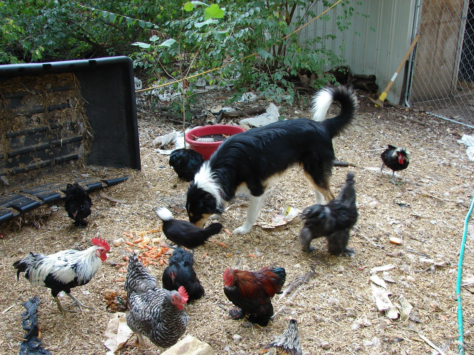 I have three dogs, a collie, a cattle dog, and a border collie mix, and no close neighbors, so mine are not penned. They know not to leave the property and do a good job of keeping everything else away. The collie takes personal responsibility for his chickens. This is Simon when he was still young and not filled out yet.