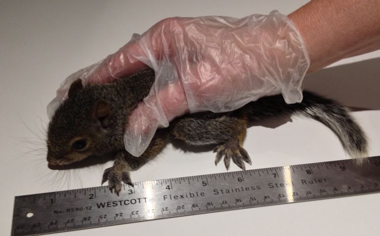 I said I'd never do this again . . . My husband found an apparently parentless baby squirrel hanging on the basement screen door with my tiger cat watching from below. My son tried to put it in several trees, but it didn't seem able to hang on very well and it returned and climbed up my son's leg! I tried putting it in some foliage, but it ran back to me and tried to nurse on my arm. I know it's best to let nature take its course, but I could not just leave out to die. I ended up going to the pet store and spending $23 (!) on puppy baby milk formula. Luckily, in my chicken first aid kit, I had some electrolytes. The baby squirrel is in a cat carrier with a cozy blanket in a bathroom. I'm guessing from this site that it is around 5 weeks old. It has bottom teeth and looks like top teeth are just starting. http://www.orphanedwildlifecare.com/squirrelcare.htm#13