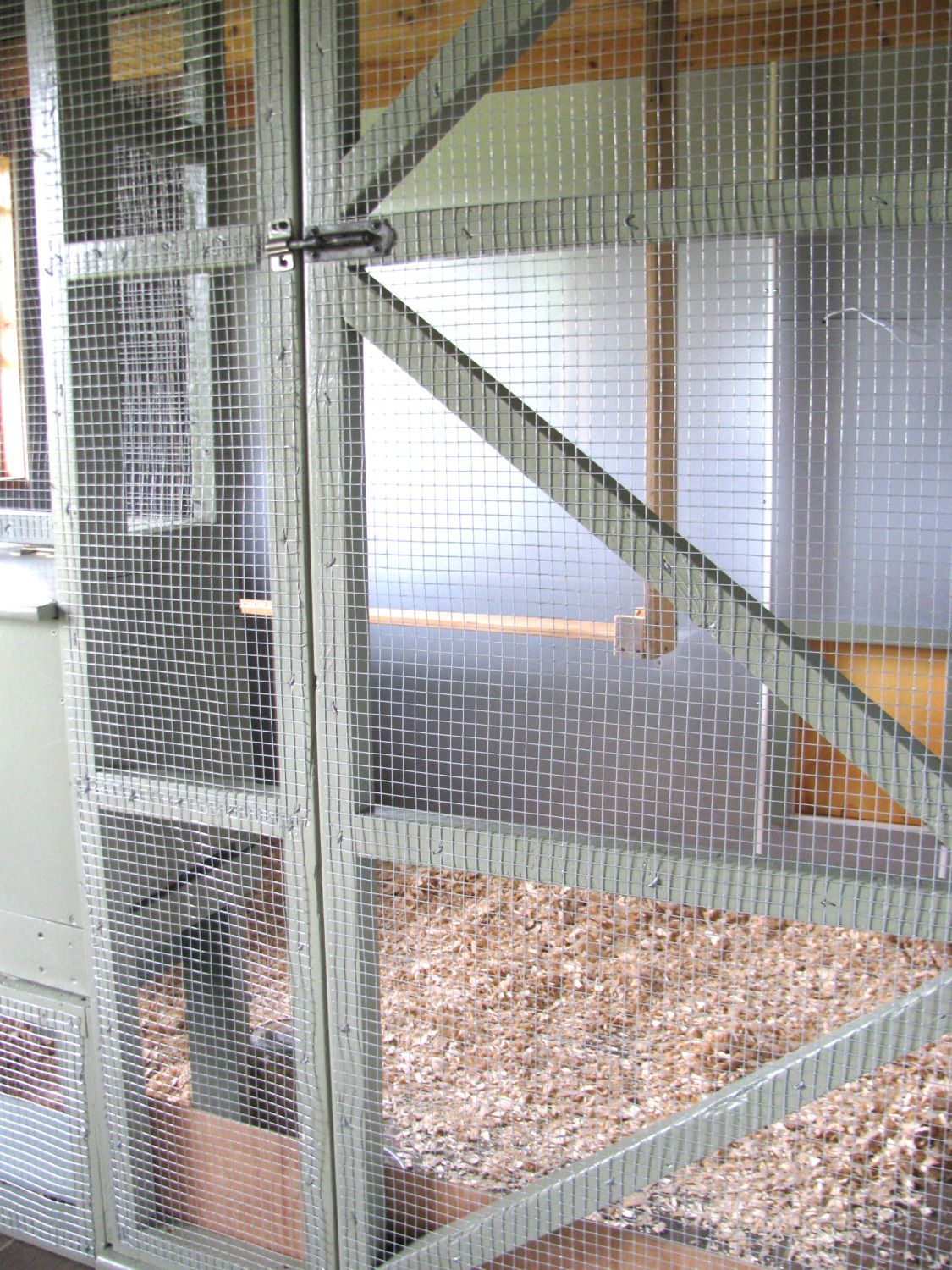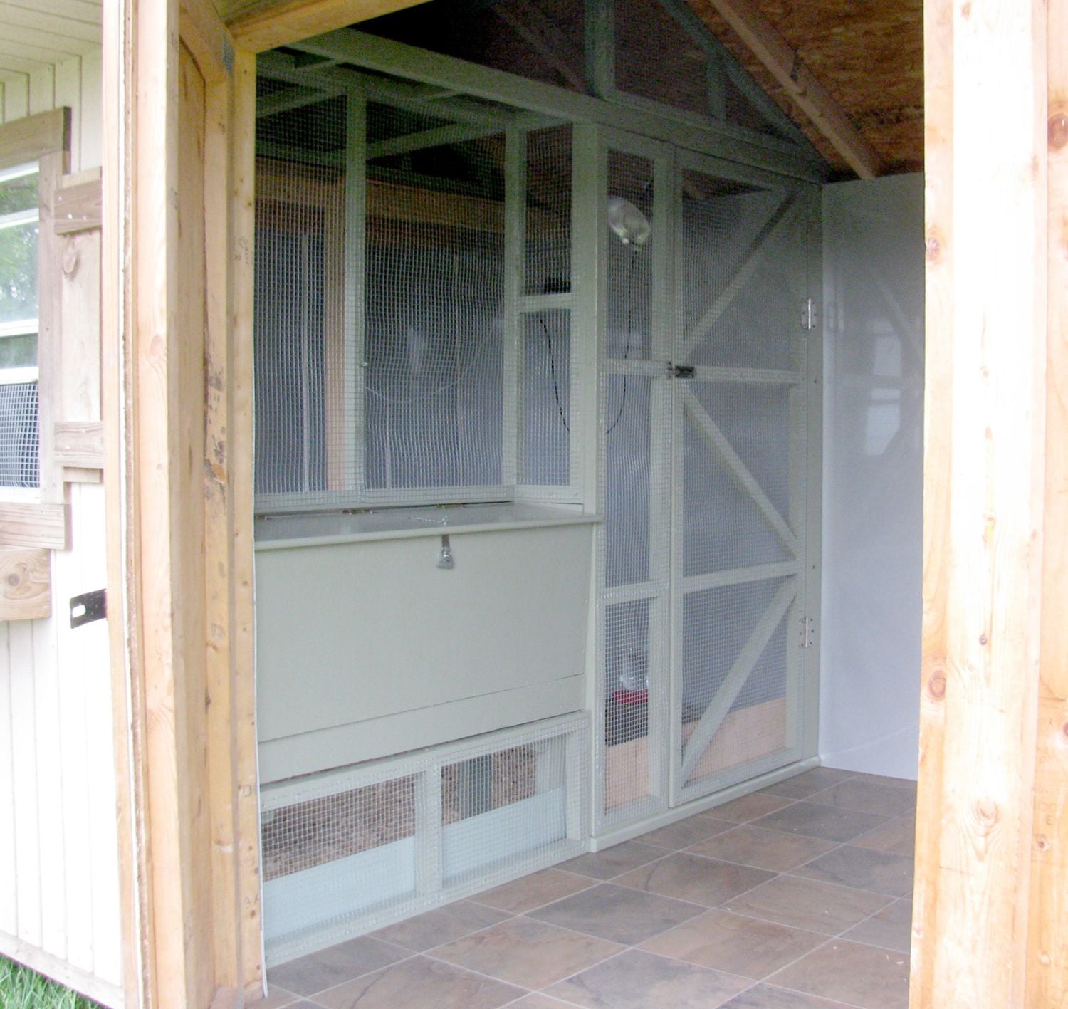 In the second phase, added more area for the chickens but it was also set so that it could be totally shut off from the other side for brooding. It stays open when no brooding is going on so they have the whole area. There is still a walk-in "people area" with a shelf for storage and enough room to have the food can, rakes, etc.