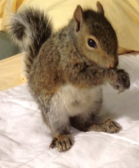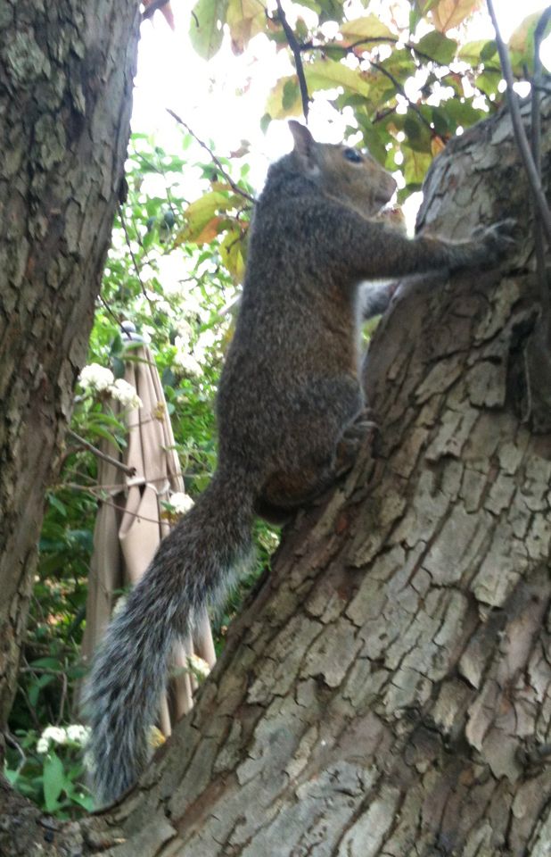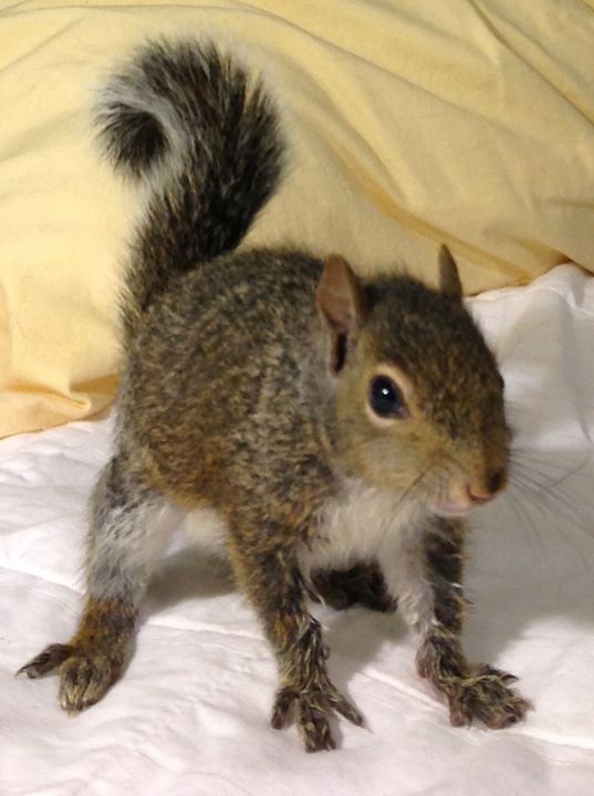 He looks great, you are doing well for himBaby Squirrel Rescue Project~ I reluctantly rescued the baby last Friday and I'm happy to say that he is making great progress. He's progressed from syringe feeding to solid food (his feet are wet in the photos from being washed after eating). He's growing fast and is so sweet. Right outside our back deck, there's a crab apple tree with several hollow branches and multiple holes, and he's already selected his home with an entrance and exit and started making bedding for it. I let him run around the tree while I watch, and he runs back to me off and on. He's not quite ready to leave the cage inside, but I'm happy that the tree is a perfect place. Our chickens and squirrels get along great. I just worry that one of my precious cats will get my precious squirrel!