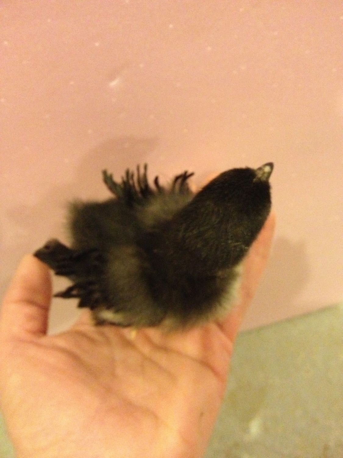 Frizzled birds will start feathering in all different directions by about a week to a week and a half old. Here is one of my frizzled cochins: 1 week old.