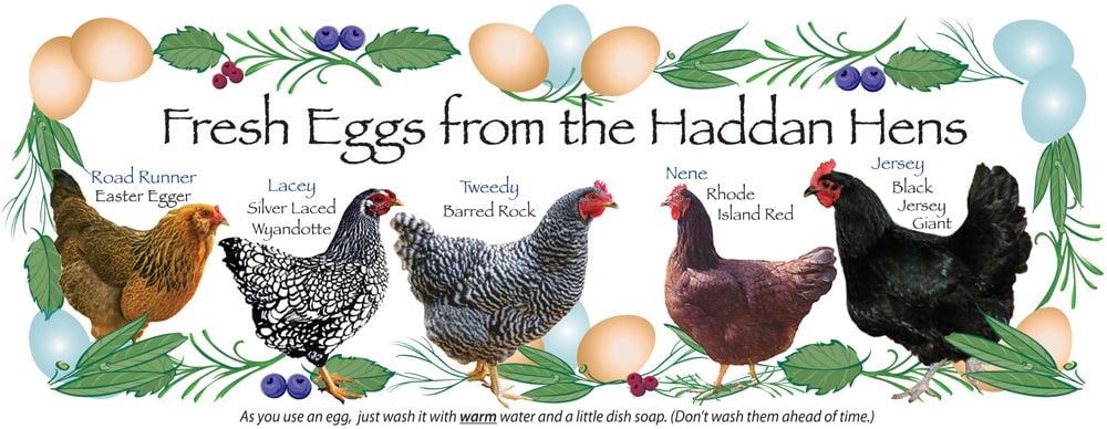 [COLOR=800080]Animal Lover~[/COLOR] Congratulations on your new business!! Just an idea [COLOR=A52A2A]since you live in Buck Creek[/COLOR], how about [COLOR=A52A2A]"Cluck Creek Eggs"[/COLOR] or [COLOR=A52A2A]"Pass the Buck Creek Eggs!"[/COLOR] (Not sure if you are familiar with the term "pass the buck.") If you would like an egg label or sign made in any style you'd envision, I'd be happy to help a young high school entrepreneur out. Just PM me. Here is the label I use (Since I don't get many eggs, I just give extras to neighbors or friends).