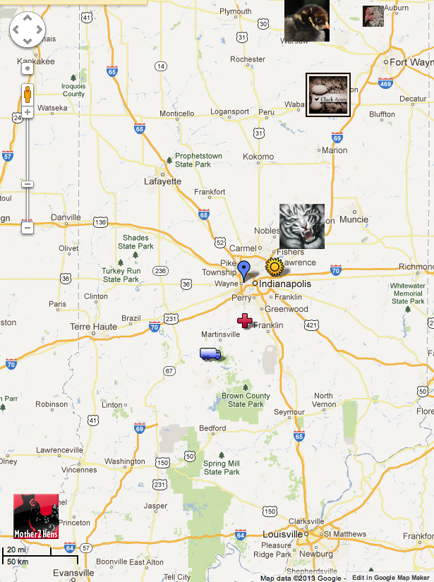 Cluck set up a cool Indiana BYC Google map: Hello you have seen the previous post about BYC members on Google Maps. Well I have made 1 for just us INDIANA BYC'ers. All you have to do is go to this link....http://goo.gl/maps/UShV6 . Here are the directions. You will see the state of Indiana.. Zoom in to where you live and then click on the red button that says Edit. After you click Edit you will see a hand, blue pin point and a zig zag line on the map. Click the pin point and drag it to where you live on the map. After you have placed your pin point then click on it and you can edit your decription by adding your county. If you want to change your blue pin point to another icon or upload your own then up on the right of that box click the pin point icon and choose others or upload your own icon. If anyone has problems with this feel free to ask.
