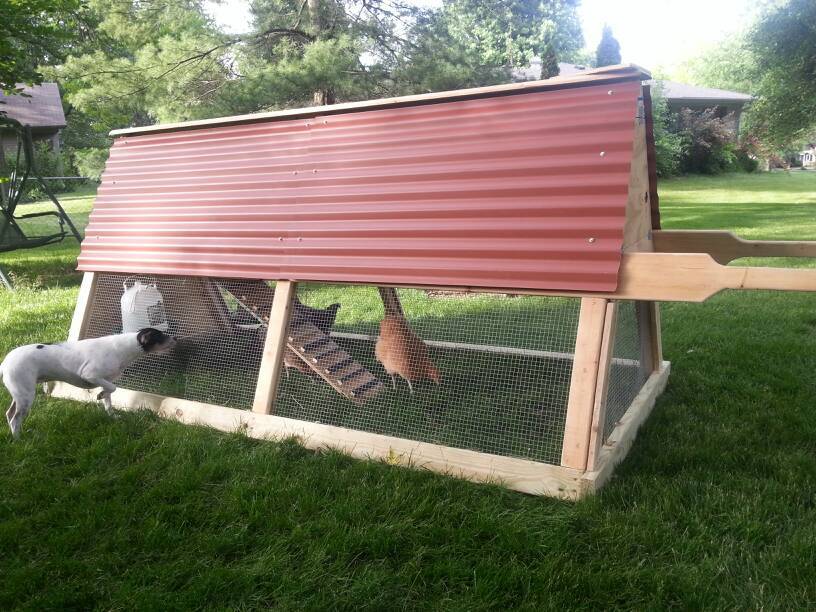 We built a Chicken Tractor last weekend and transported it and our flock of 4 Hens to my parents house on Indy's South Side where chickens are allowed. They have adjusted to the move beautifully and seem to love the Tractor. I think the fresh grass, insects, and worms help. I need to figure out a roosting bar for the tractor and put on the wheels for easier moving.