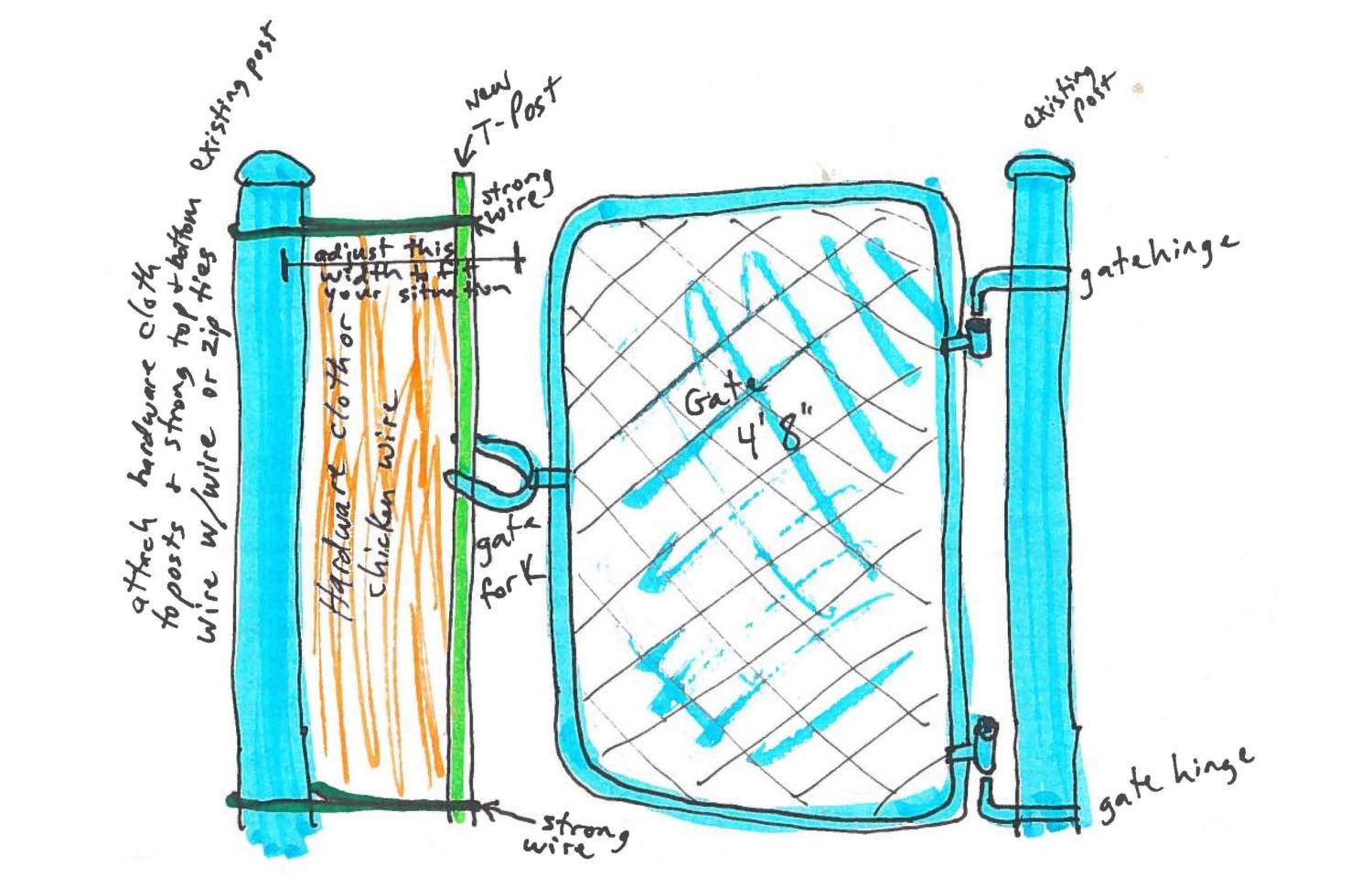 You should still be able to make a gate that is smaller than your opening work for you. You said you already took down your top rails, but the corner posts are still there, right? You'll need a set of gate hinges, a fork latch, some 11 gauge wire (or similiar), and a T-post. Check out the drawing, and let me know if it needs tweaks to work for your situation.