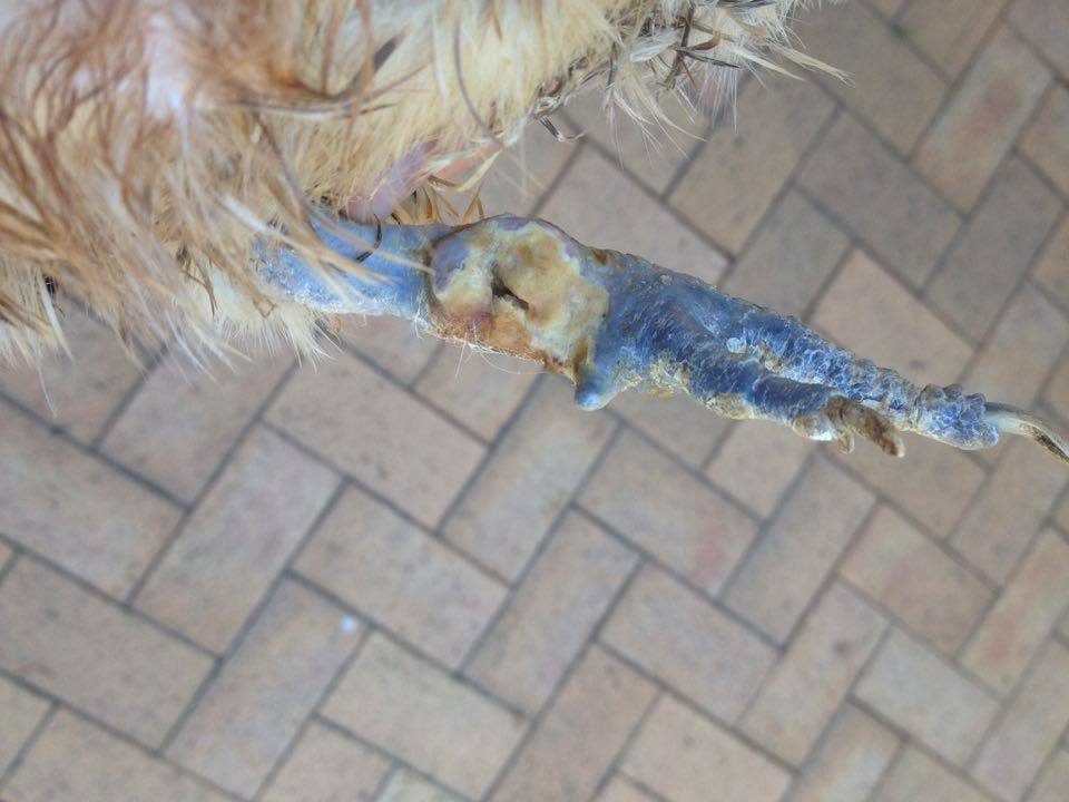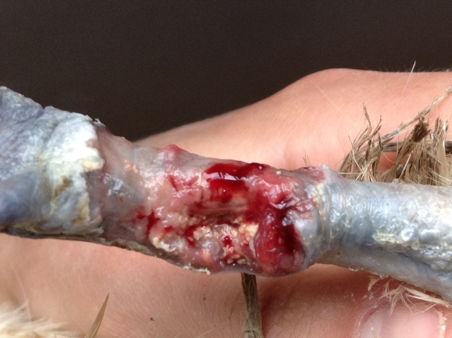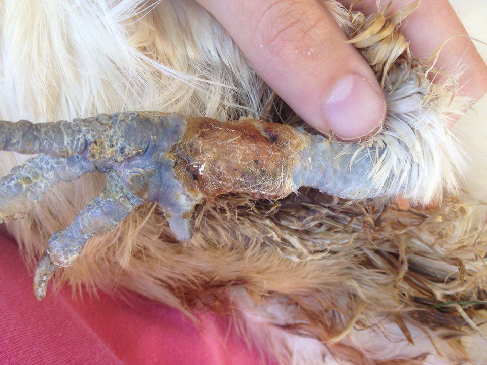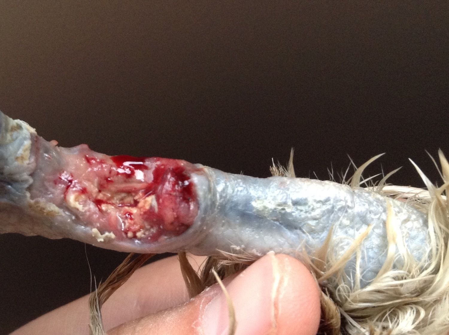 Help! My hen has been limping for a few days now so I decided to take a look at her leg. I eventually found (after removing the dirt), a massive & gruesome wound on her leg. Her spur was gone and beside it was this creamy-looking stuff in her leg [that I assume is infection]. I don't know whether it is actually infected, how long she's had the injury for or how she got it. After rinsing her leg, I took a gauze pad, put some antibiotic ointment on it and wrapped her wound up with some vet-wrap tape.