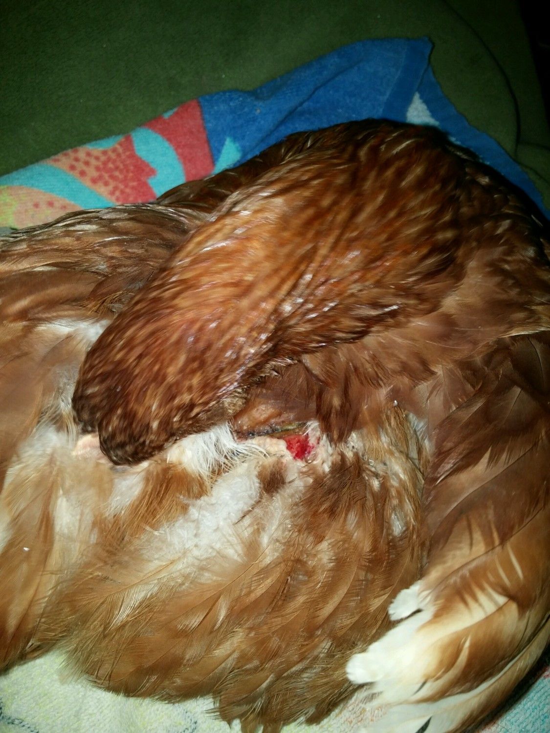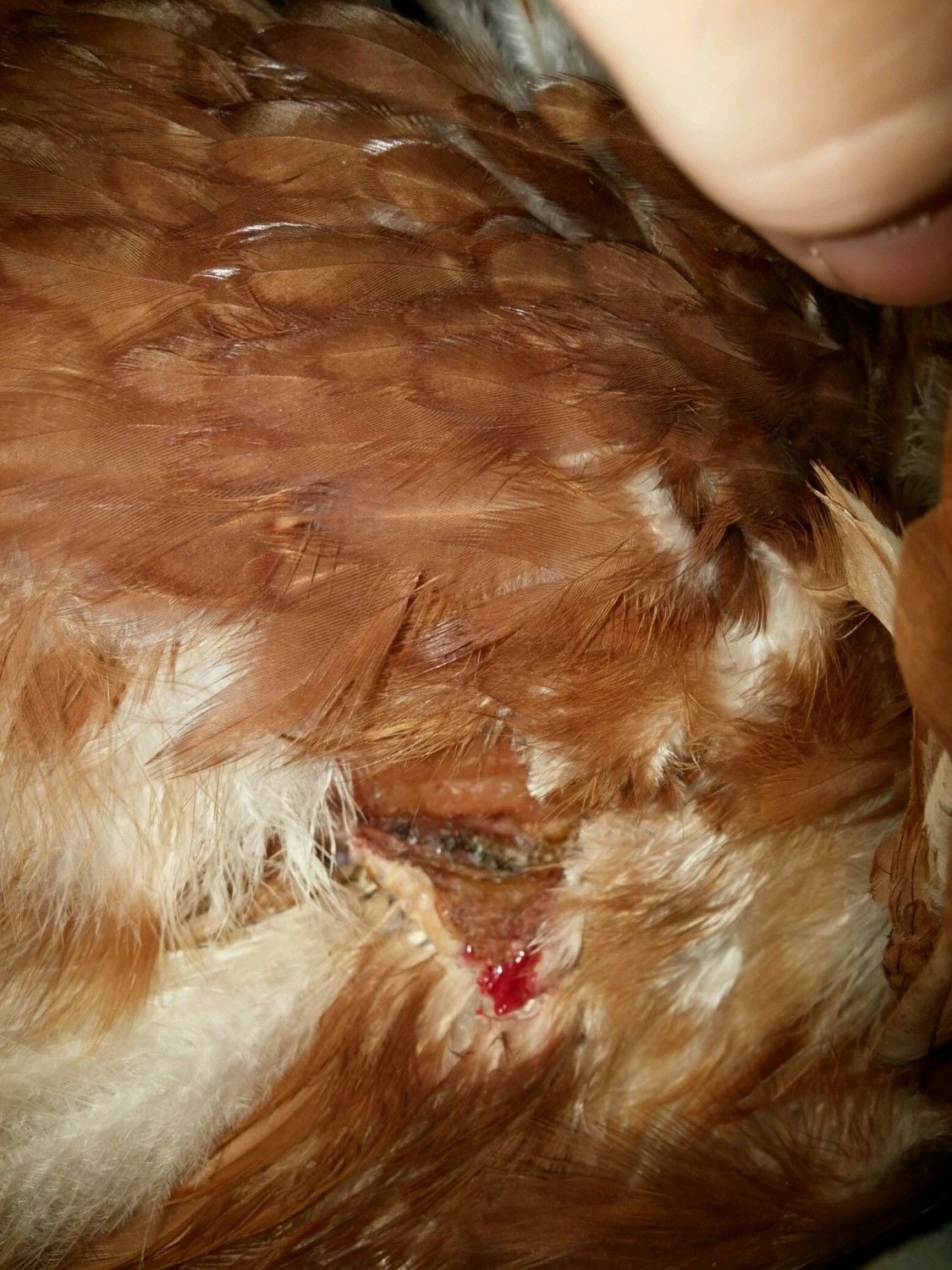 One of our 4 month old Golden Comet Hens was injured the other day (4 days ago now). She had a whole chunk of skin (size of a golf ball) ripped from her right side. We assume it was and over-zealous mount attempt from one of our 5 mo. old roosters. However when we found it it was not "fresh". We immediately separated her from the flock to prevent further damage/injury. The flap created by this injury would not adhere to the rest of her skin and has not "died-off" as we suspected it would.