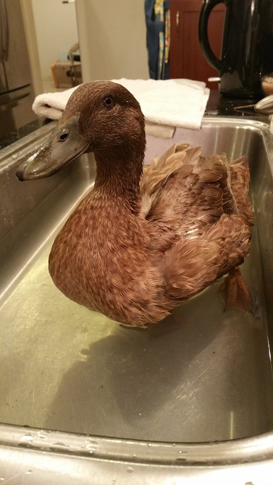 @Miss Lydia During bath time she mostly pulls it up and tucks it under her body while she swims around with the other foot. I had my mother take a look at it today as well. She's a nurse, so I figured she'd know a little about the looks of her leg/foot. She agreed with me that it doesn't look broken, but badly sprained. I was most concerned that because she just lets it hang there and doesn't use it that it was perhaps "dead" but it still has color and it is swollen, so we both felt it was still getting blood flow. It's interesting to me that it doesn't bother her when I prod around that foot. She definitely has use at that leg joint (the knee?) and there is no swelling there, just the foot. I had my mom look at the bottom of her foot as well and see didn't see any little dots that might be a splinter or bumble foot (and i've shown here before what that looks like and had her help me remove a suspicious spot on one of the ducks feet). She will barley hobble around on it, and only if needed. I'm concerned she's not eating enough, but she is interested when I put veggies in the tub with her and she will eat some of those. She is drinking water and she is taking care of her feathers.