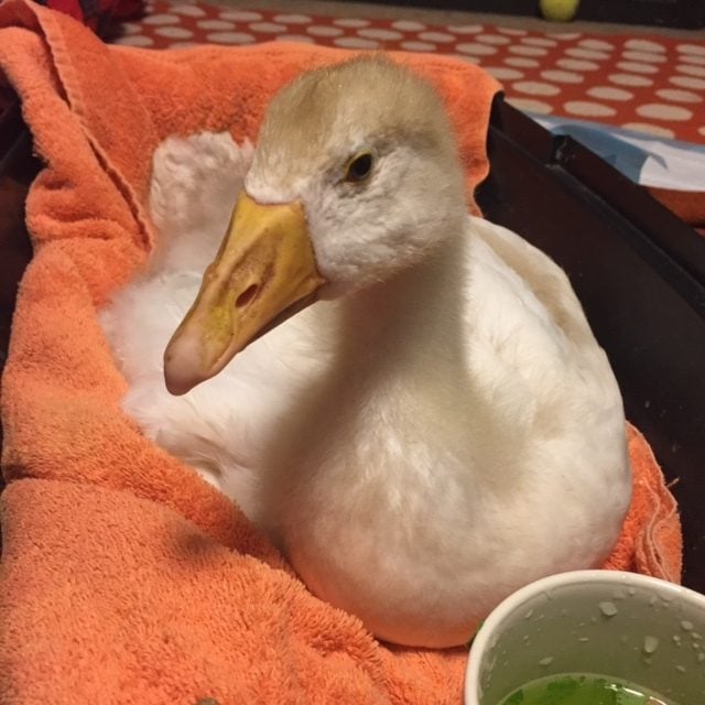I rescued a 5-6 week old Embden gosling yesterday from my local vet. It's leg was probably bit by a snapping turtle. It's on antibiotics and pain meds but the emergency vet didn't really know a lot about waterfowl. There's also a 1" hole in the webbing of her foot. Was thinking they should have sewn it up, but wasn't sure. Any suggestion for care? Here is a photo of the leg. I will get more later when he/she is standing up.
