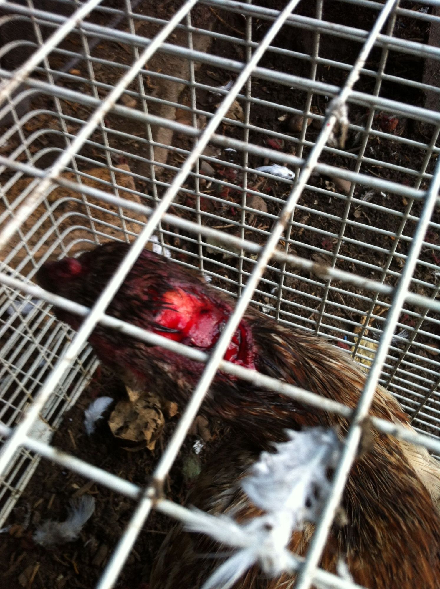 I was too late as the stag had damaged the poor hen. Somehow he had managed to tear chunks of skin off her head!!